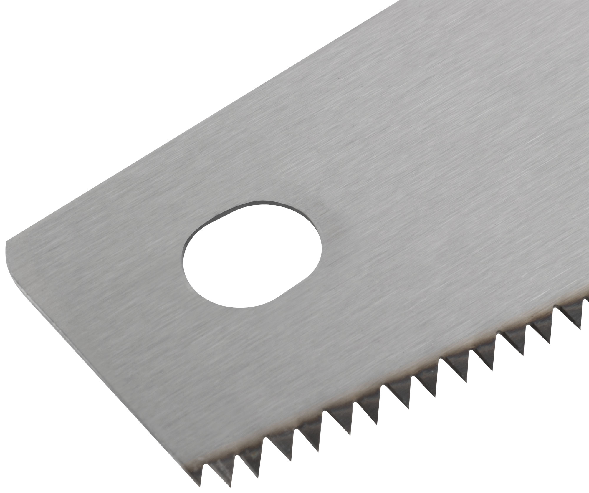 Средний зуб (7 TPI). Для работы с мягкими и твердыми породами древесины, фанерой, ДСП. Зубья с двугранной заточкой, разведены, имеют высокочастотную закалку. Материал: высокоуглеродистая сталь, пластиковая ручка с прорезиненной вставкой.