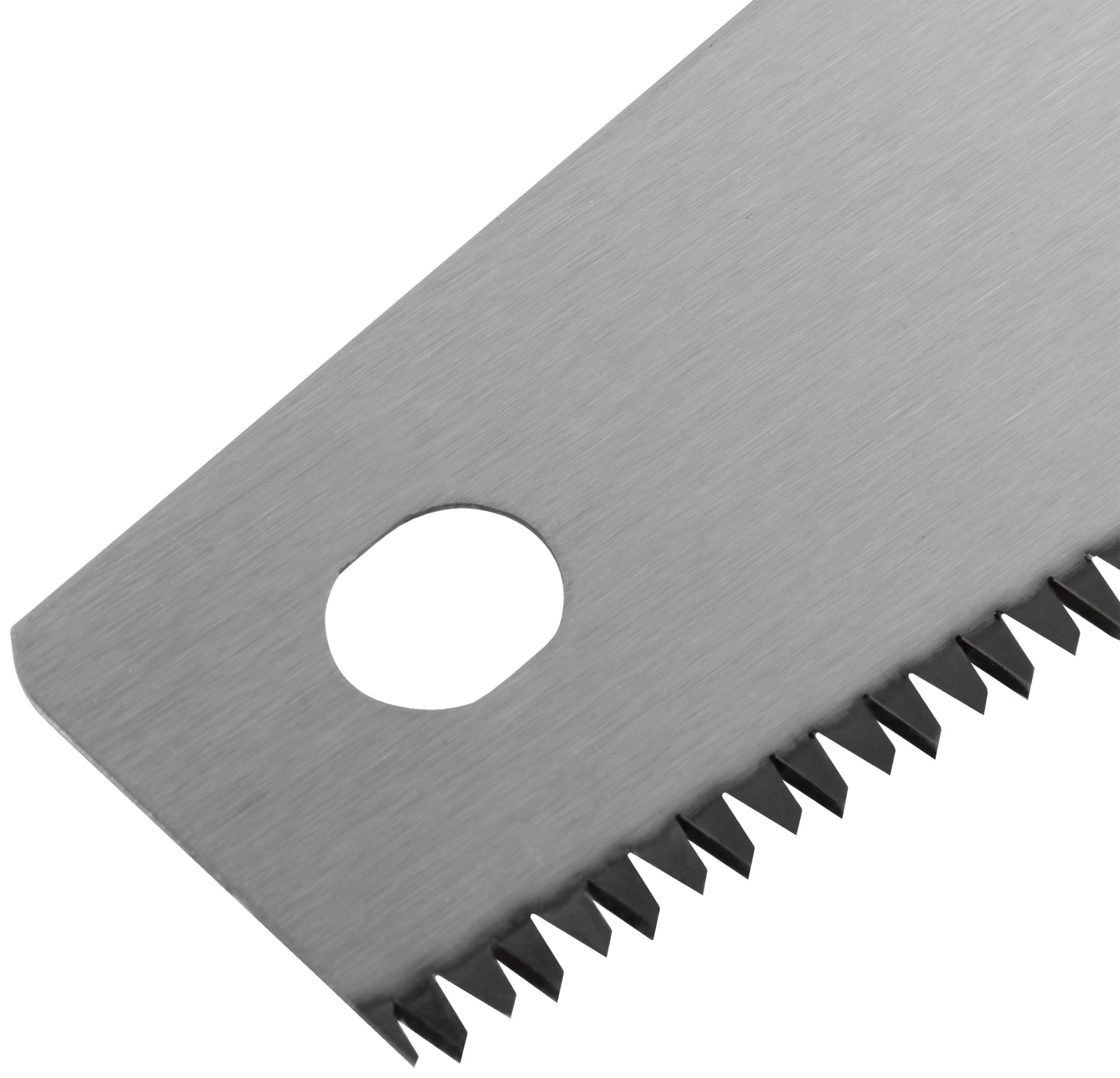 Профи. По древесине мягких и твёрдых пород, ДСП, фанере и ПВХ. Средние (7 зубьев на дюйм) калёные зубья со специальной 3-х гранной заточкой пилят вдоль и поперек волокон, обеспечивая чистоту реза и высокую точность. Материал: высокоуглеродистая инструментальная сталь, пластиковая ручка с прорезиненной вставкой.
