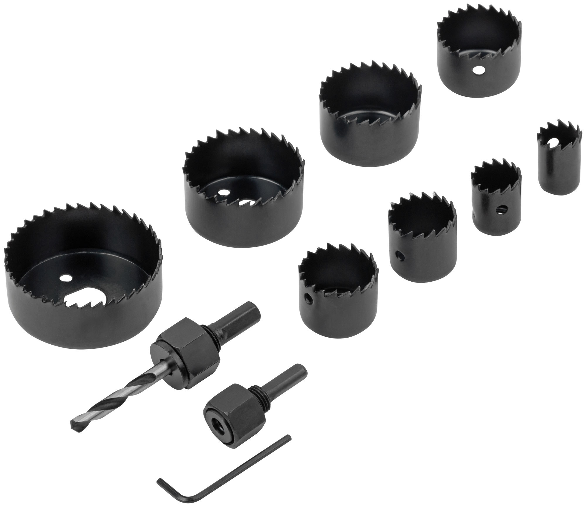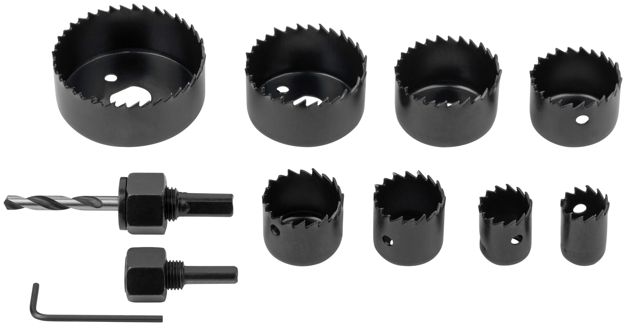 Усиленный адаптер. Профи. Для высверливания отверстий в древесине твердых и мягких пород, ДСП и фанере. В наборе 8 пил круговых: 19, 22, 29, 32, 38, 44, 51 и 64 мм. Материал: термообработанная усиленная инструментальная сталь. Упаковка: пластиковый кейс.