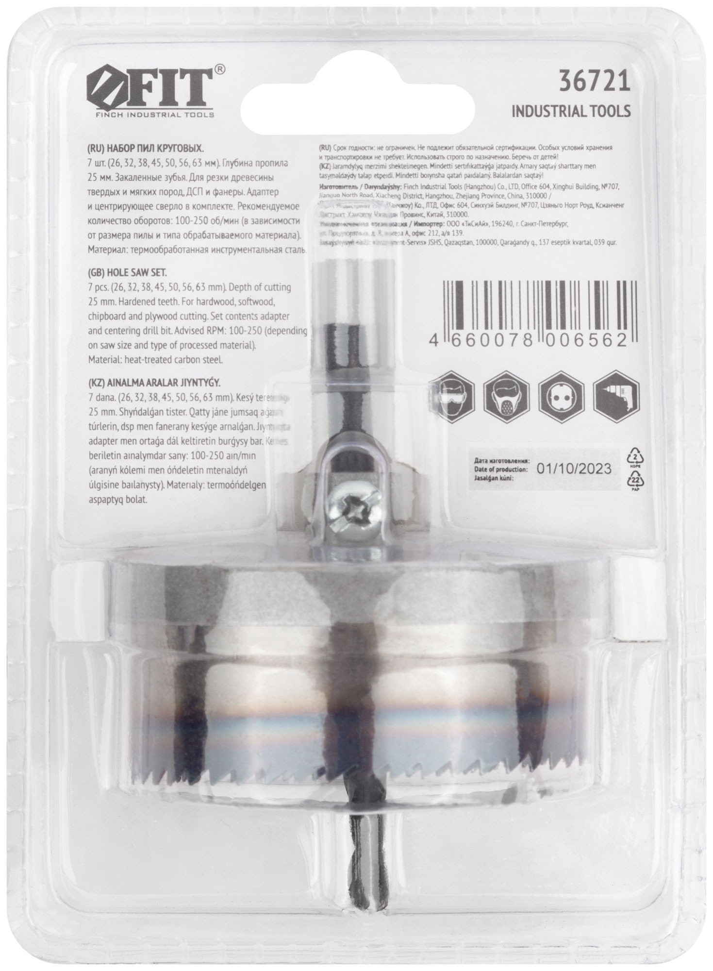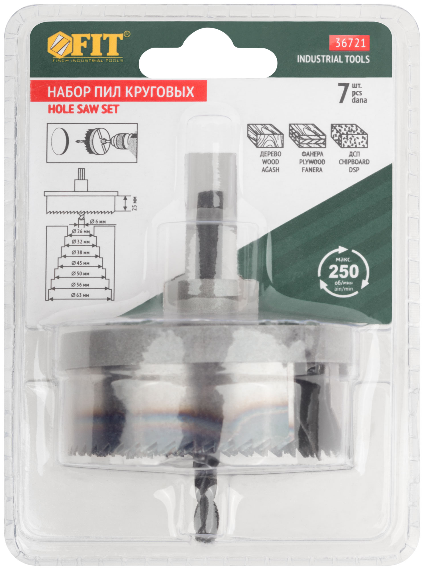 Каленый зуб. Для высверливания отверстий в древесине твердих и мягких пород, ДСП и фанере. В наборе 7 пил круговых: 26, 32, 38, 45, 50, 56 и 63 мм. Материал: инструментальная сталь. Упаков-ка: блистер