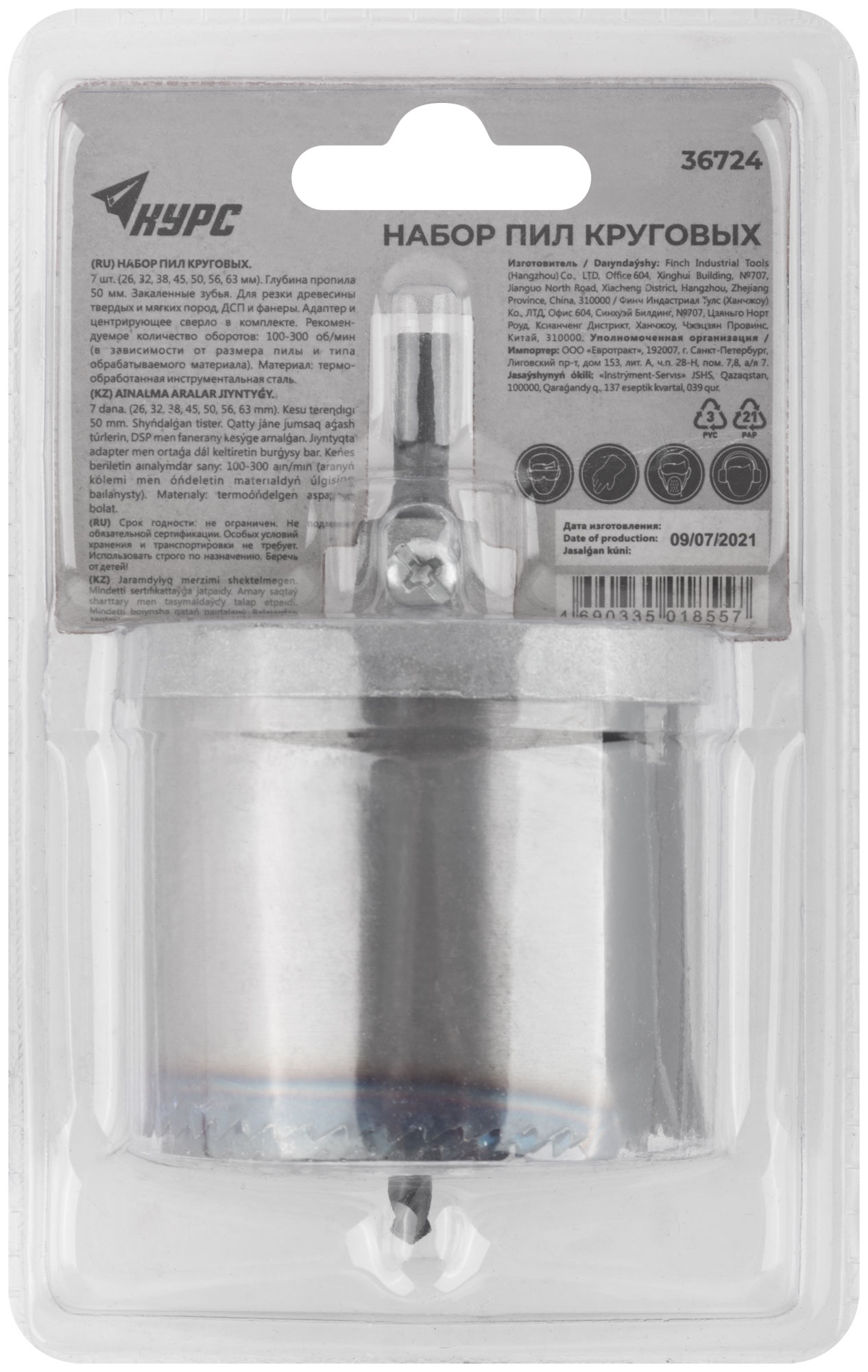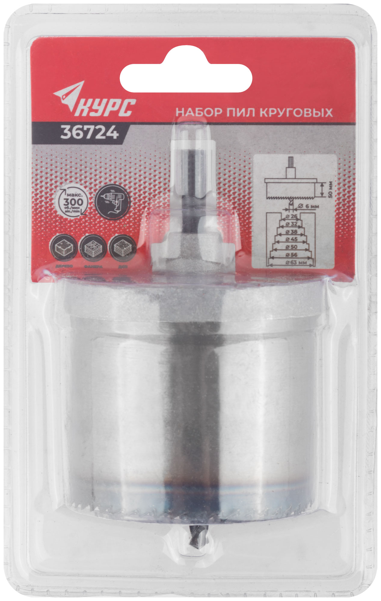 Для высверливания отверстий в древесине твер-дих и мягких пород, ДСП и фанере. В наборе 7 пил круговых: 26, 32, 38, 45, 50, 56 и 63 мм. Материал: инструментальная сталь. Упаковка: блистер