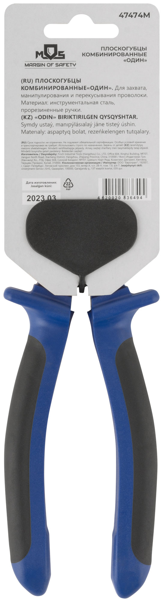 Плоскогубцы комбинированные "Один" двухцветные обрезиненные ручки, полированная сталь 200 мм