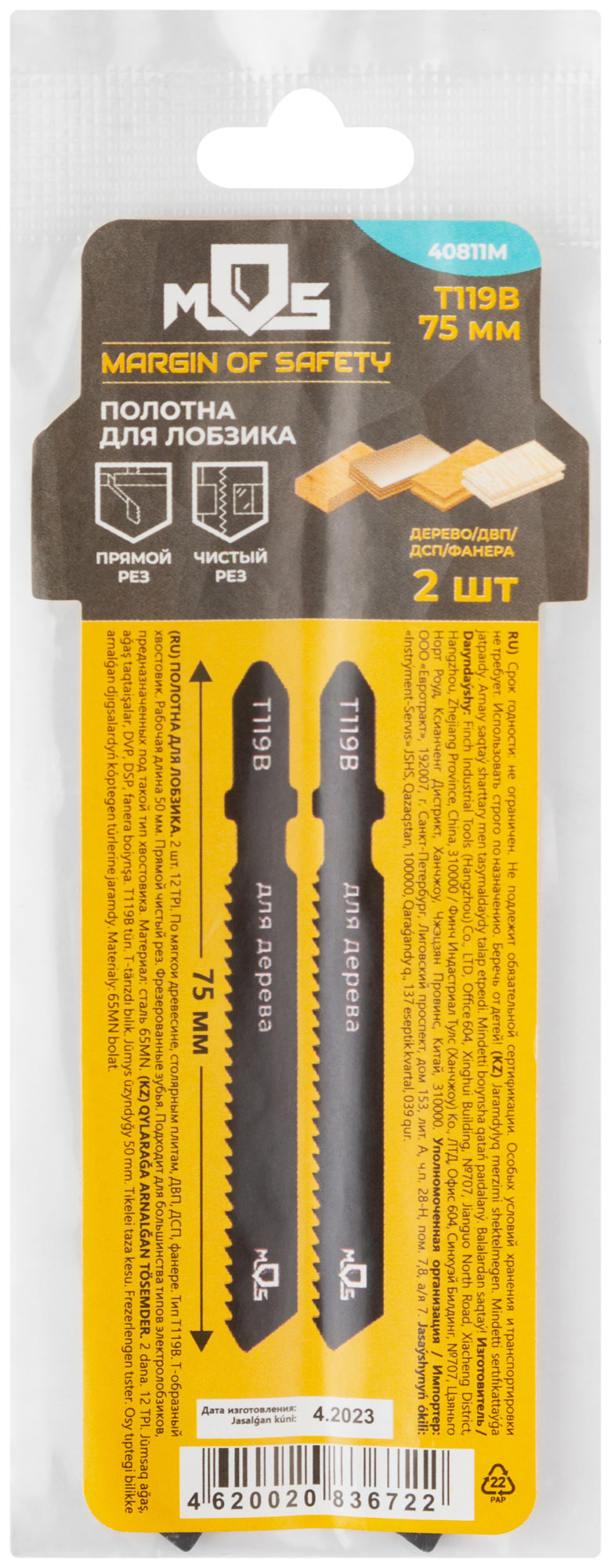 Т119В. Набор 2 шт. Зубья: фрезерованные. Прямой чистый рез. Для резки мягкой древесины, столярных плит, ДВП, ДСП, фанеры. Т-образный хвостовик. Материал: Cталь 65MN. Упаковка: пакет с подвесом.