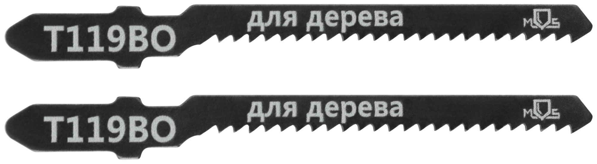 Т119ВО. Набор 2 шт. Зубья: фрезерованные. Криволинейный чистый рез. Для резки мягкой древесины, столярных плит, ДВП, ДСП, фанеры. Т-образный хвостовик. Материал: Cталь 65MN. Упаковка: пакет с подвесом.