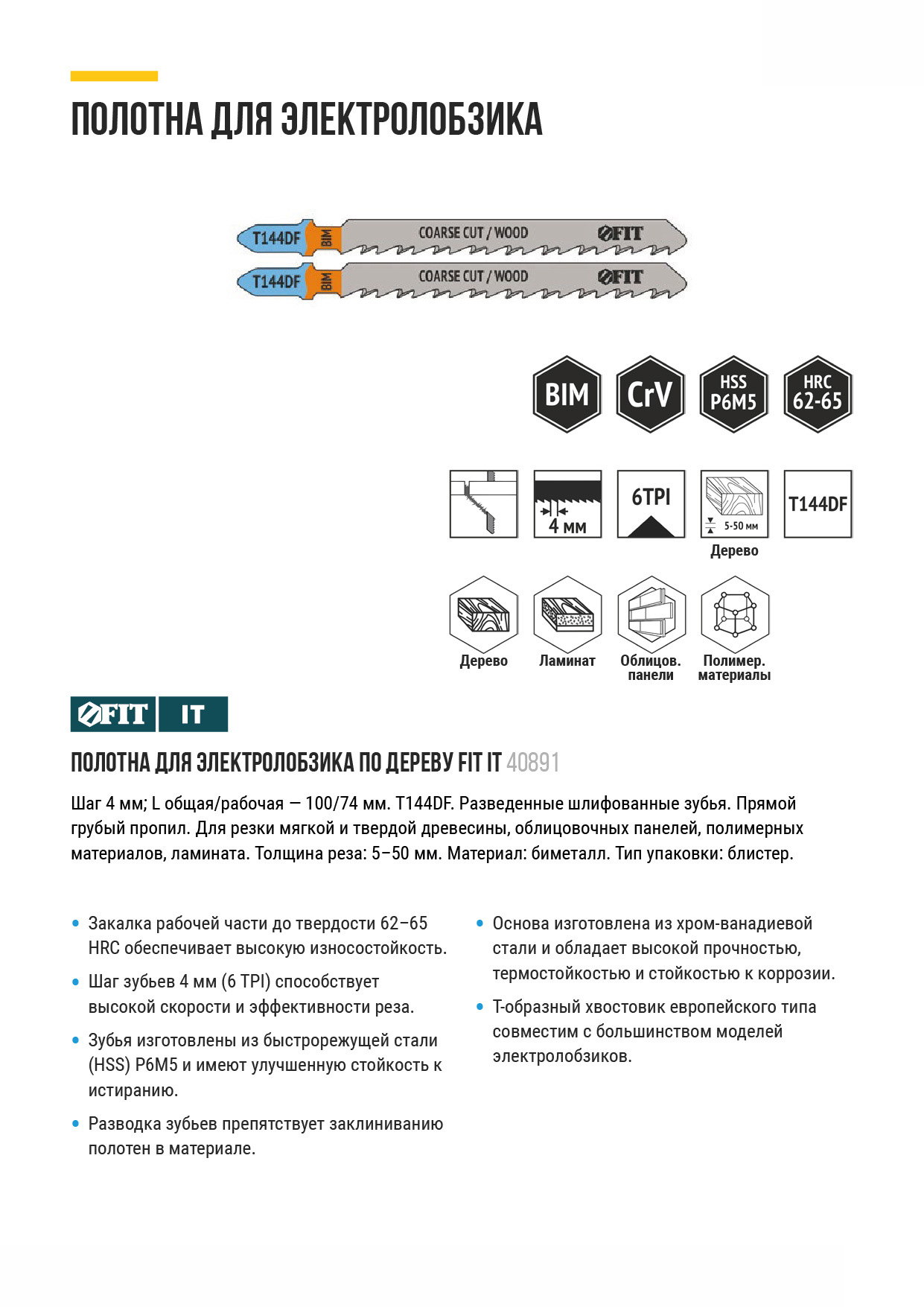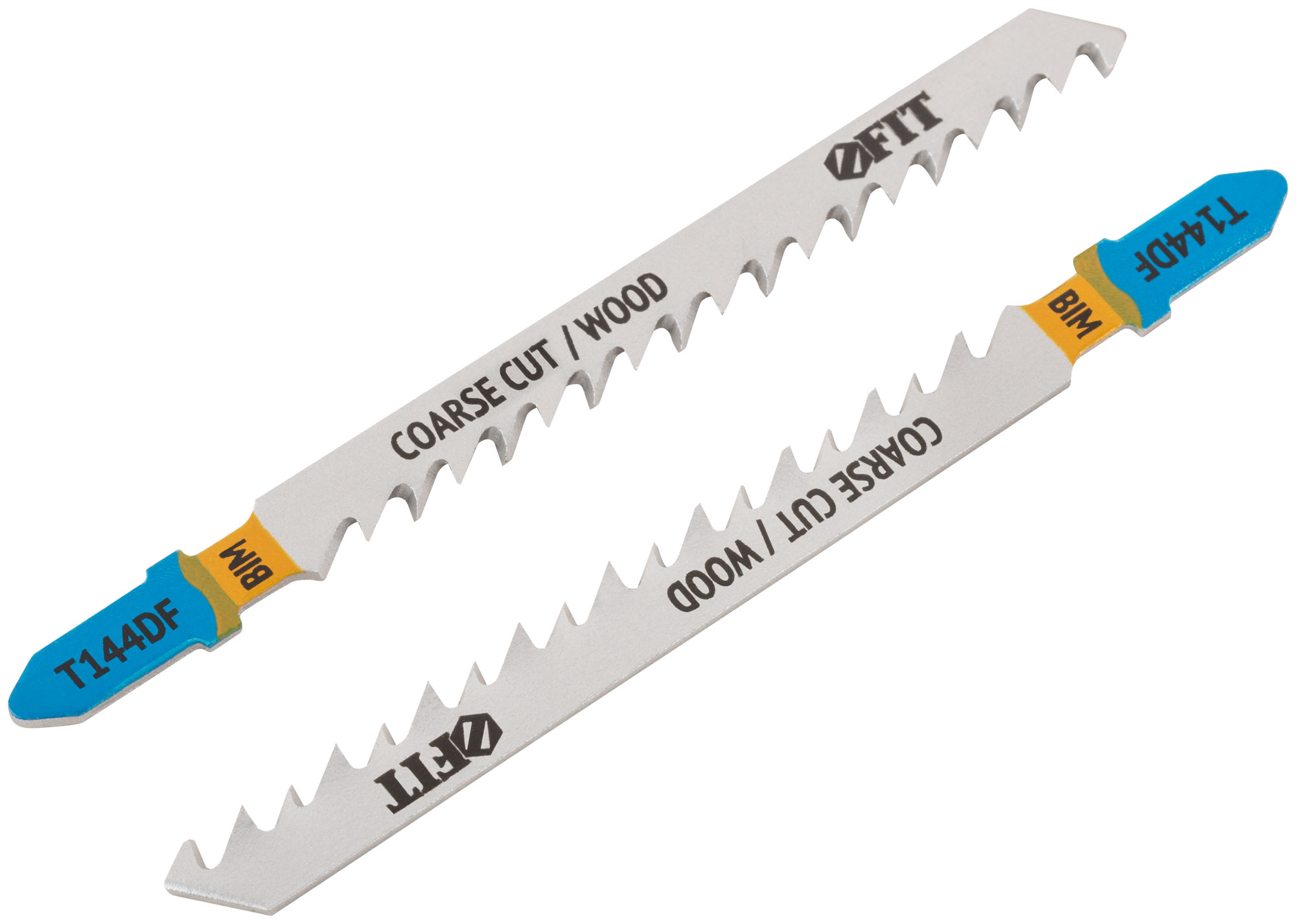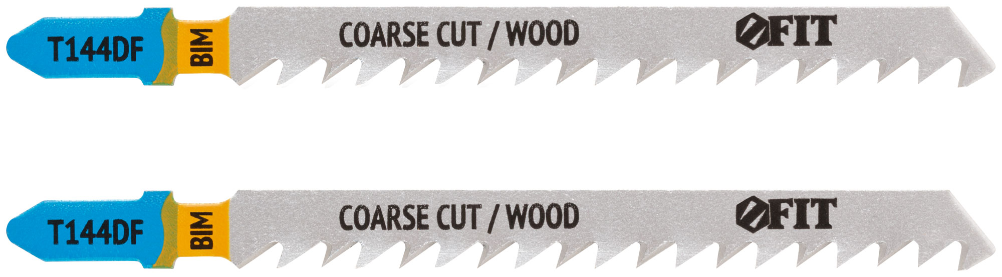 T144DF. Разведенные шлифованные зубья. Прямой грубый пропил. Для резки мягкой и твердой древесины, облицовочных панелей, полимерных материалов, ламината. Толщина реза: 5-50 мм. Материал: биметалл. Упаковка: блистер.
