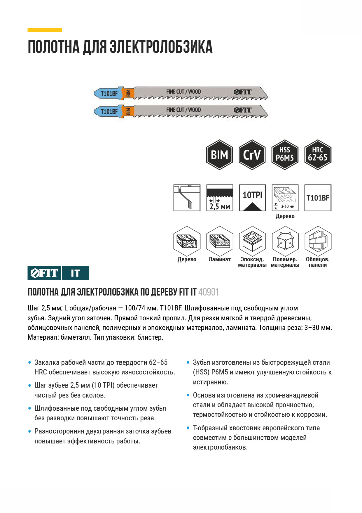 T101BF. Шлифованные под свободным углом зубья, задний угол заточен. Прямой тонкий пропил. Для резки мягкой и твердой древесины, облицовочных панелей, полимерных и эпоксидных материалов, ламината. Толщина реза: 3-30 мм. Материал: биметалл. Упаковка: блистер.