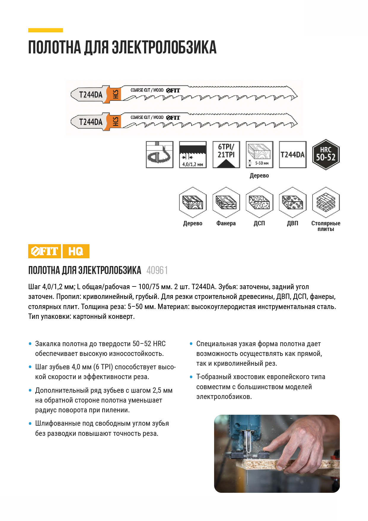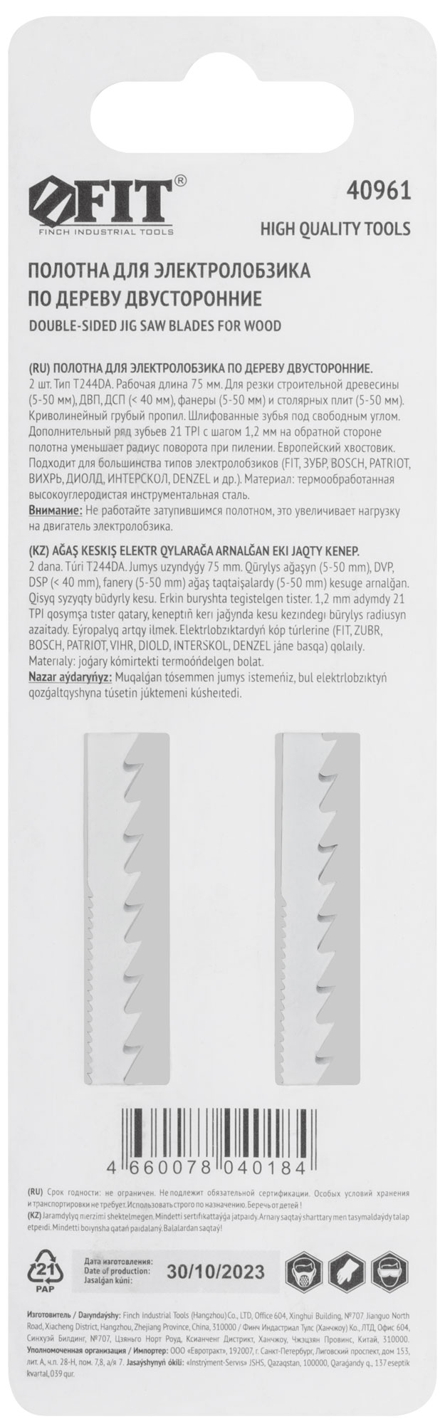 T244DA. Зубья: заточены, задний угол заточен. Пропил: криволинейный, грубый. Дополнительный ряд зубьев с шагом 1,2 мм на обратной стороне полотна уменьшает радиус при пилении. Для резки строительной древесины, ДВП, ДСП, фанеры, столярных плит. Толщина реза: 5-50 мм. Материал: высокоуглеродистая инструментальная сталь. Упаковка: картонный конверт.