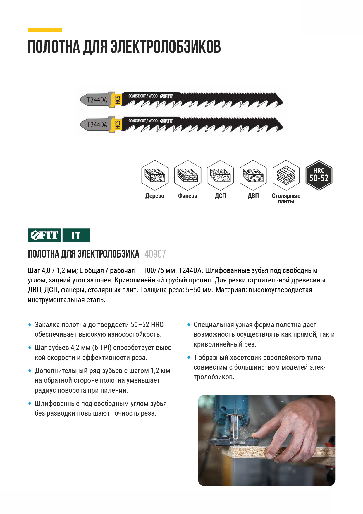 T244DA. Шлифованные зубья под свободным углом, задний угол заточен. Криволинейный грубый пропил. Дополнительный ряд зубьев с шагом 1,2 мм на обратной стороне полотна уменьшает радиус при пилении. Для резки строительной древесины, ДВП, ДСП, фанеры, столярных плит. Толщина реза: 5-50 мм. Материал: высокоуглеродистая инструментальная сталь. Упаковка: блистер.