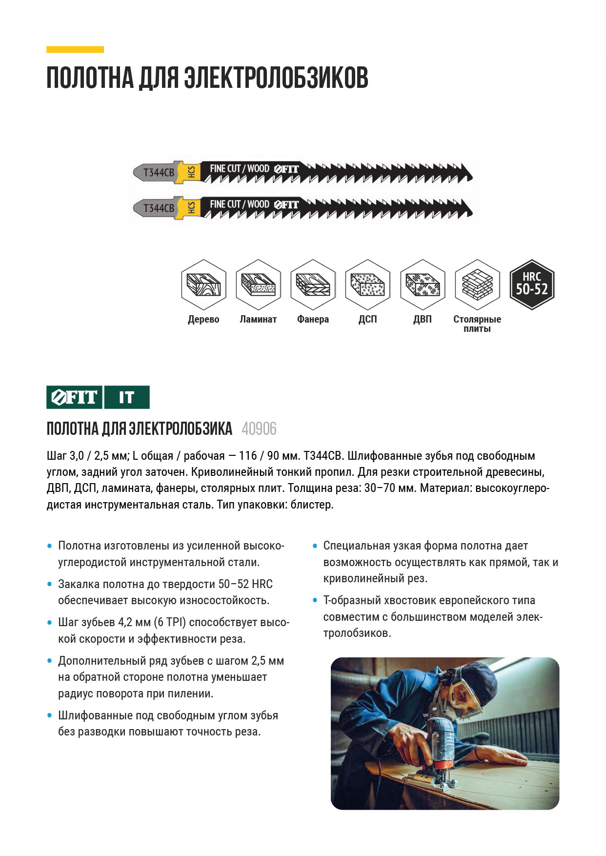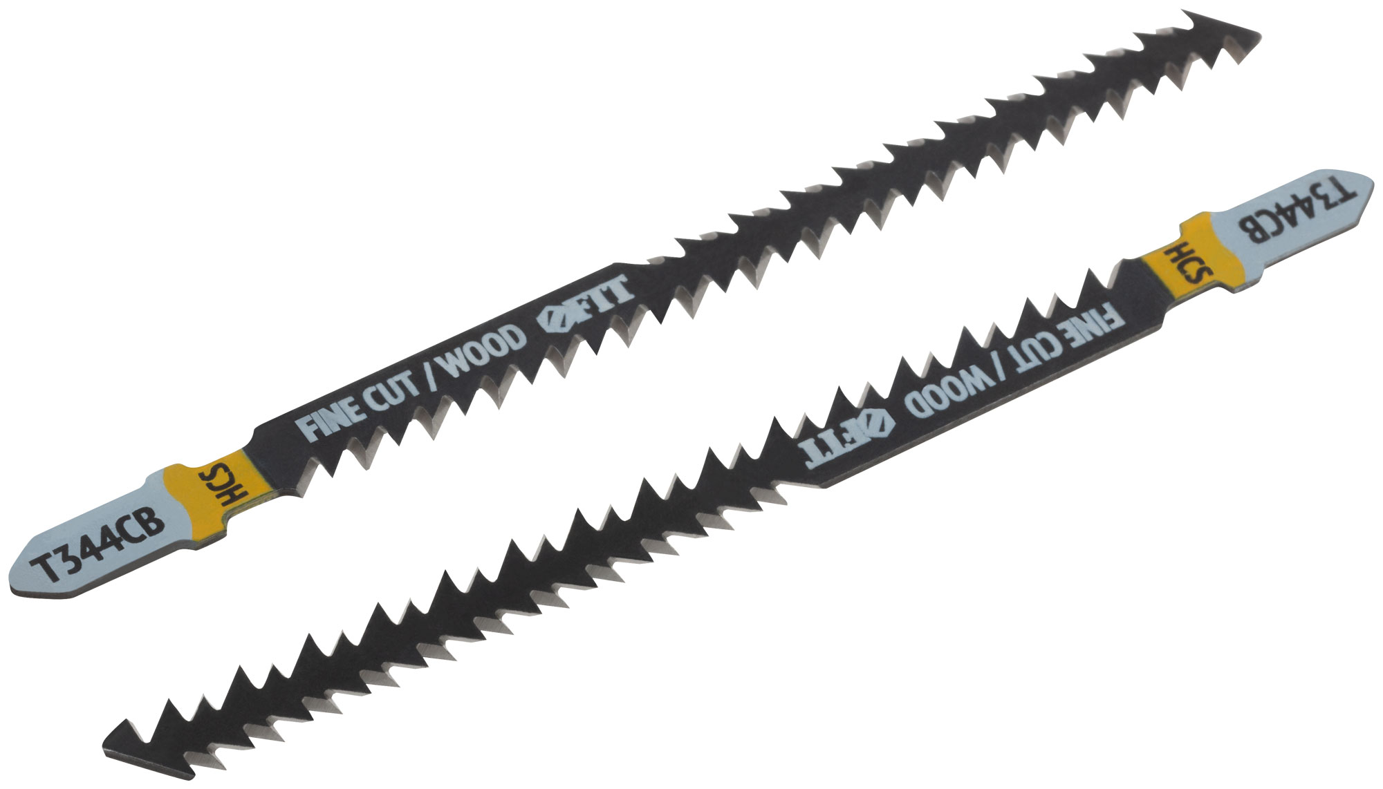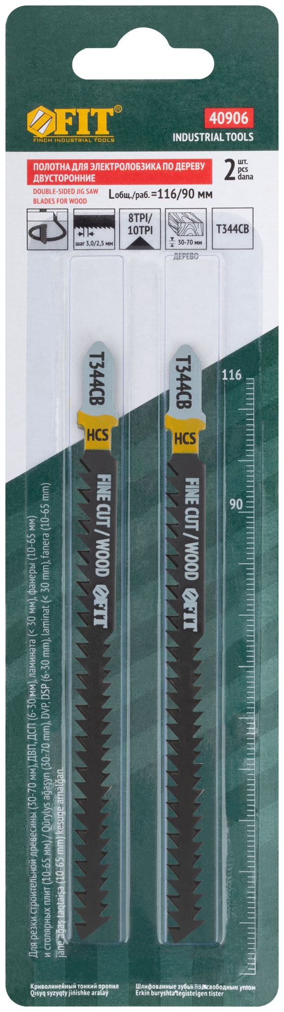 T344CB. Шлифованные зубья под свободным углом, задний угол заточен. Криволинейный тонкий пропил. Дополнительный ряд зубьев с шагом 2,5 мм на обратной стороне полотна уменьшает радиус поворота при пилении. Для резки строительной древесины, ДВП, ДСП, ламината, фанеры, столярных плит. Толщина реза: 30-70 мм. Материал: высокоуглеродистая инструментальная сталь. Упаковка: блистер.