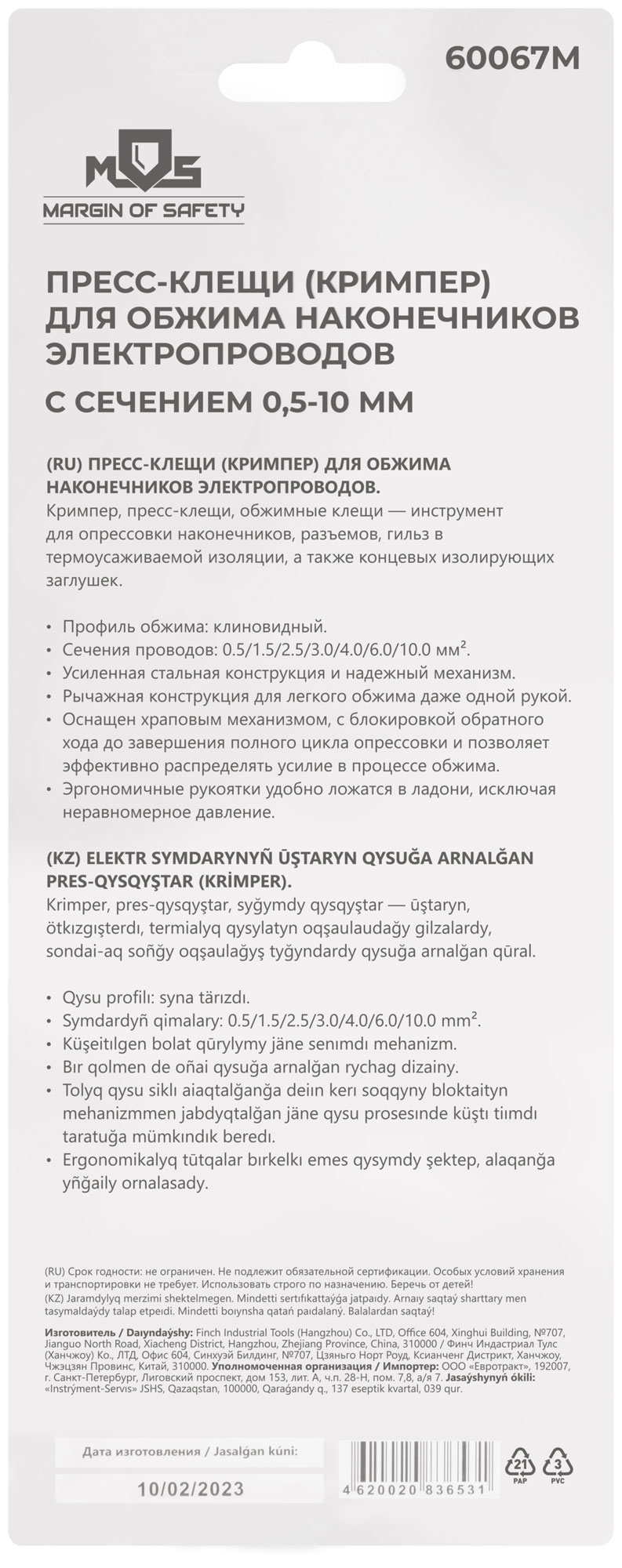 Пресс-клещи (кримпер) для обжима наконечников электропроводов с сечением 0,5-10 мм