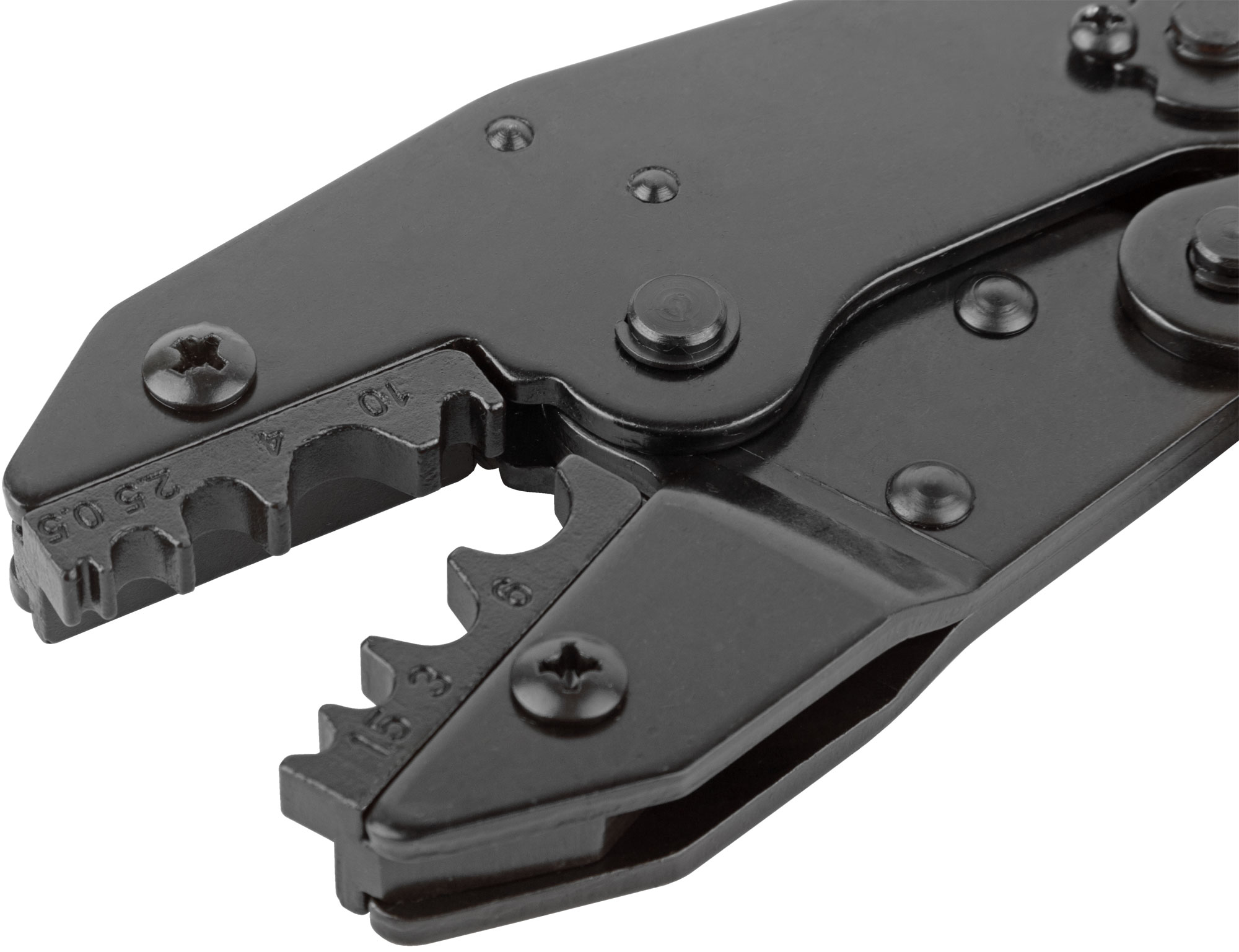 Для опрессовки наконечников, разъемов, гильз в термоусаживаемой изоляции, а также концевых изолирующих заглушек. Усиленная стальная конструкция и надежный механизм. Рычажная конструкция для легкого обжима. Оснащен храповым механизмом, с блокировкой обратного хода до завершения полного цикла опрессовки и позволяет эффективно распределять усилие в процессе обжима. Эргономичные рукоятки удобно ложатся в ладони, исключая неравномерное давление. Материал: высокоуглеродистая сталь, пластиковые ручки. Упаковка: блистер.