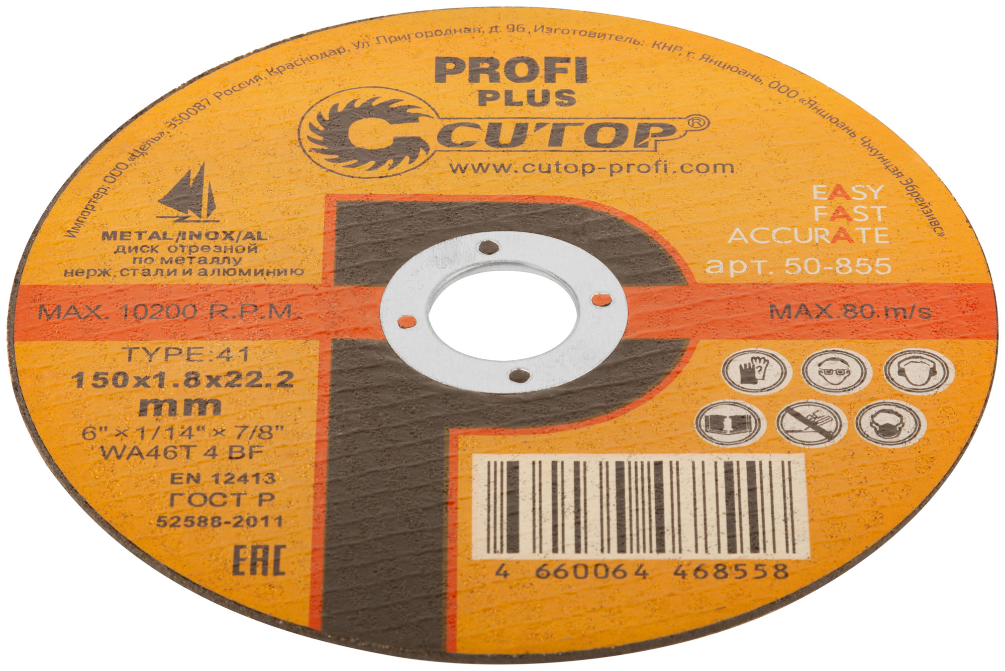 CUTOP Profi PLUS. Использованы уникальные технологии производства. Профессиональный отрезной диск для промышленного использования на основе монокристаллического электрокорунда, который улучшает КПД диска и позволяет увеличить количество резов в несколько раз. Предназначен для резки металла и нержавеющей стали. Для углошлифовальных машин. Посадочный диаметр 22,2 мм.
