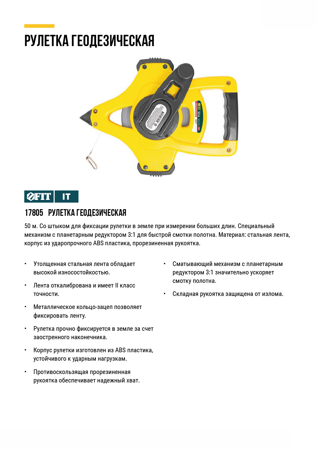 Со штыком для фиксации рулетки в земле при измерении больших длин. Специальный механизм с планетарным редуктором 3:1 для быстрой смоткиполотна. Материал: стальная лента, корпус из ударопрочного ABS пластика, прорезиненная ручка.