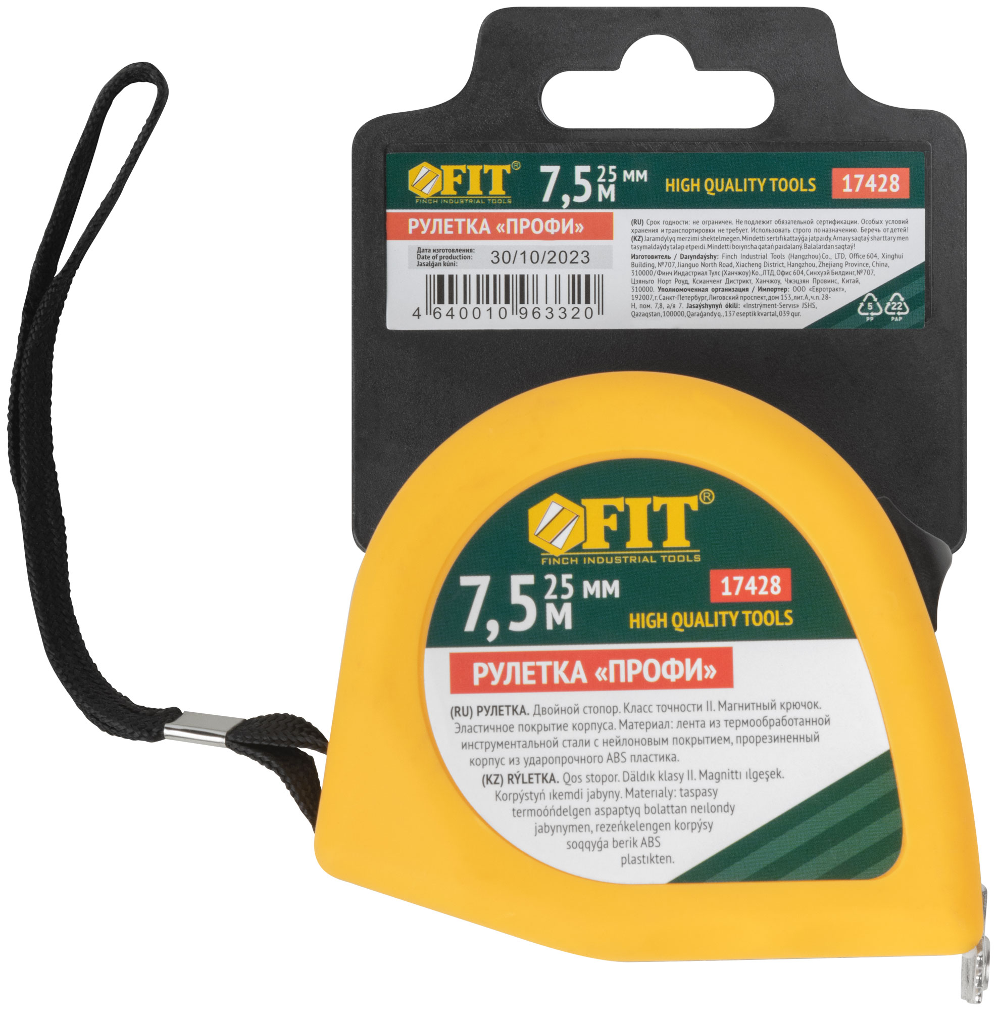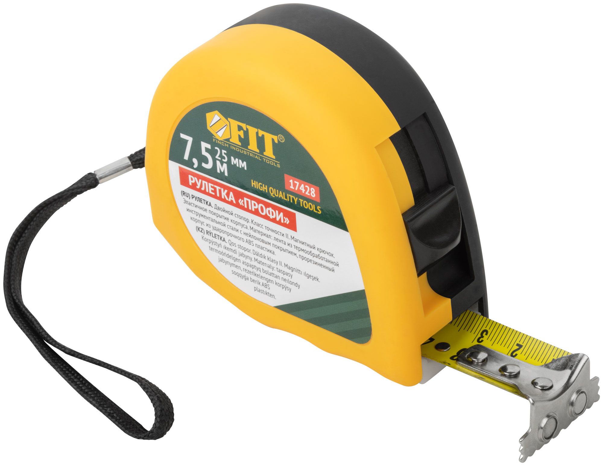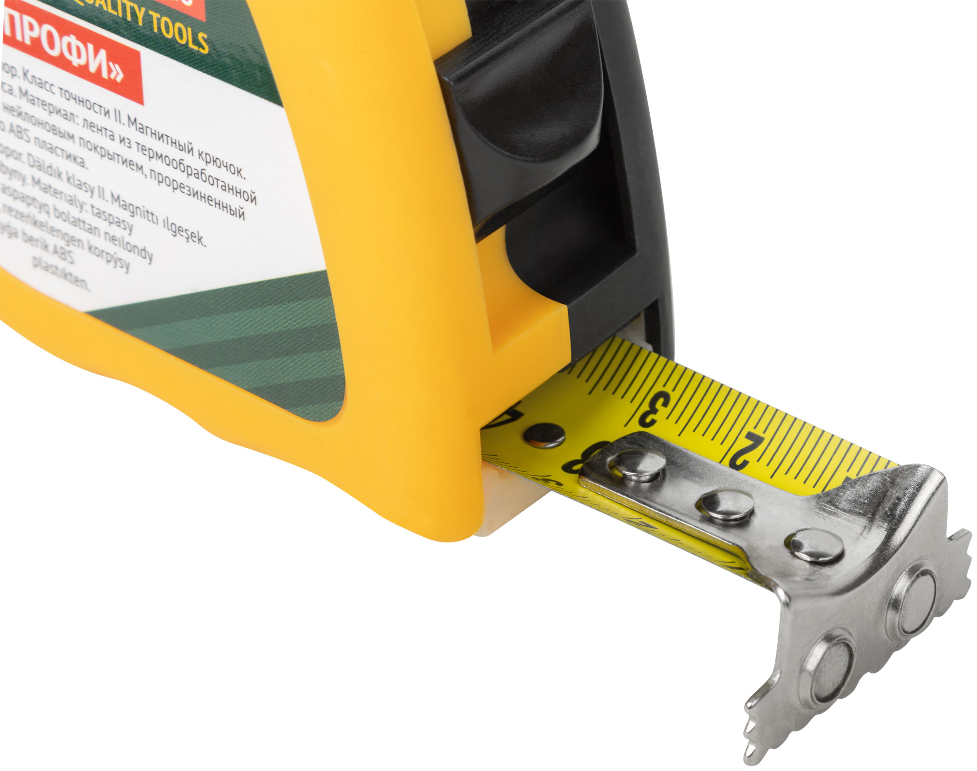 «Профи». Калиброванная лента класс II, двойной стопор, магнитный крючок. Материал: стальная лента с нейлоновым покрытием, эластичный двухцветный ABS пластиковый противоударный корпус. Упаковка: пластиковый подвес.