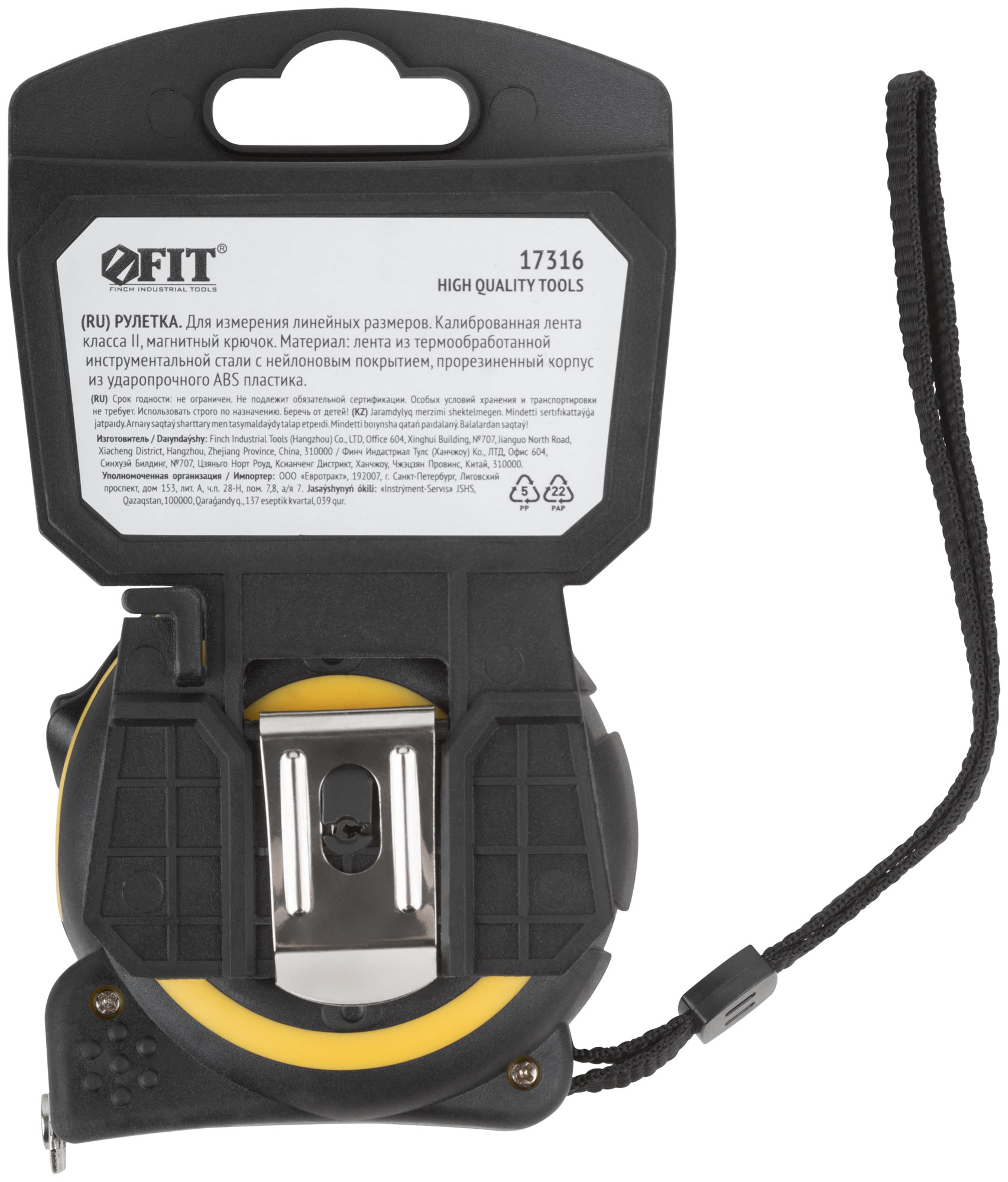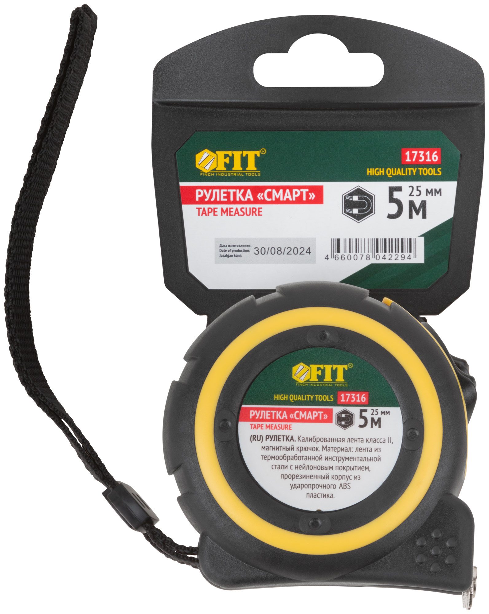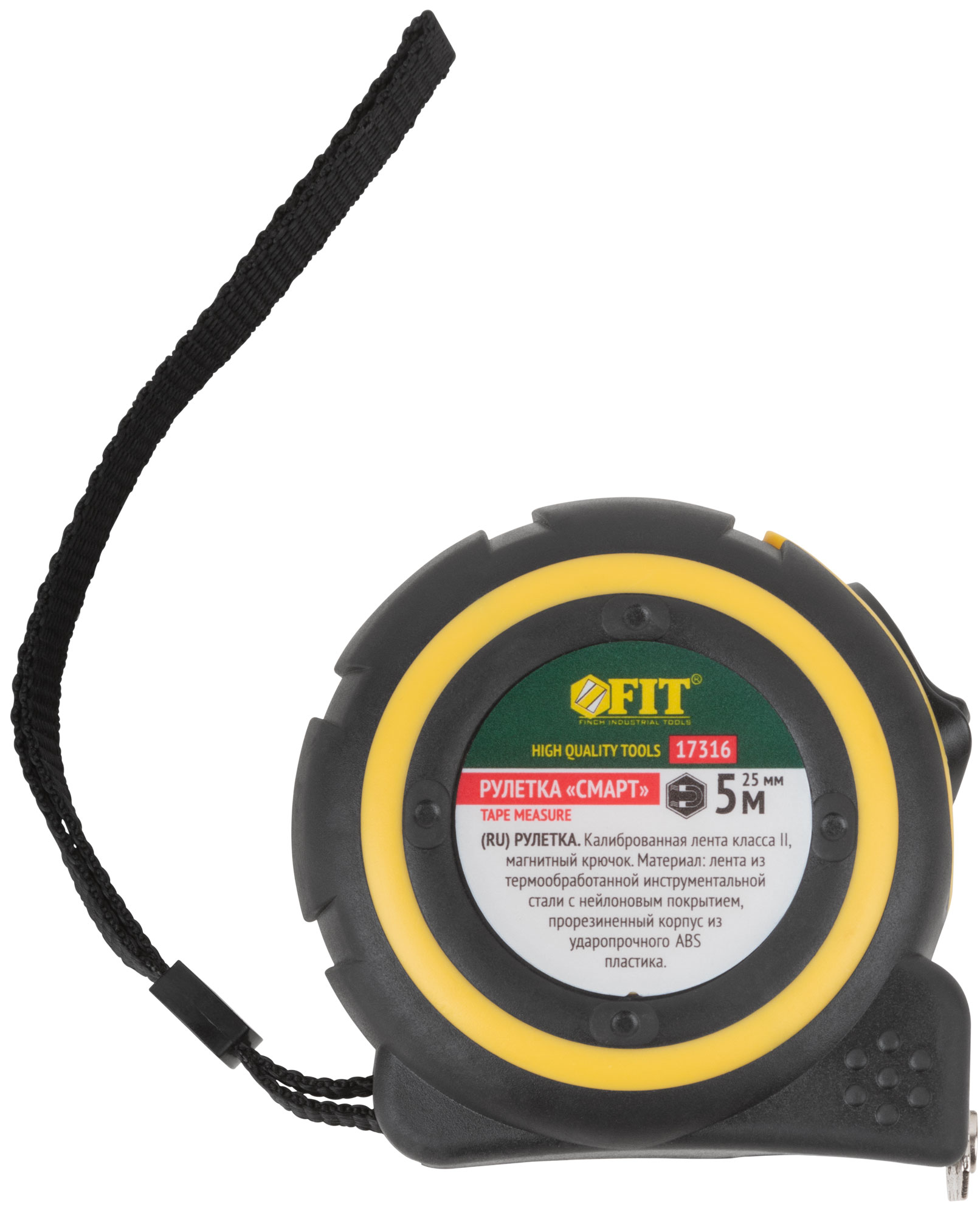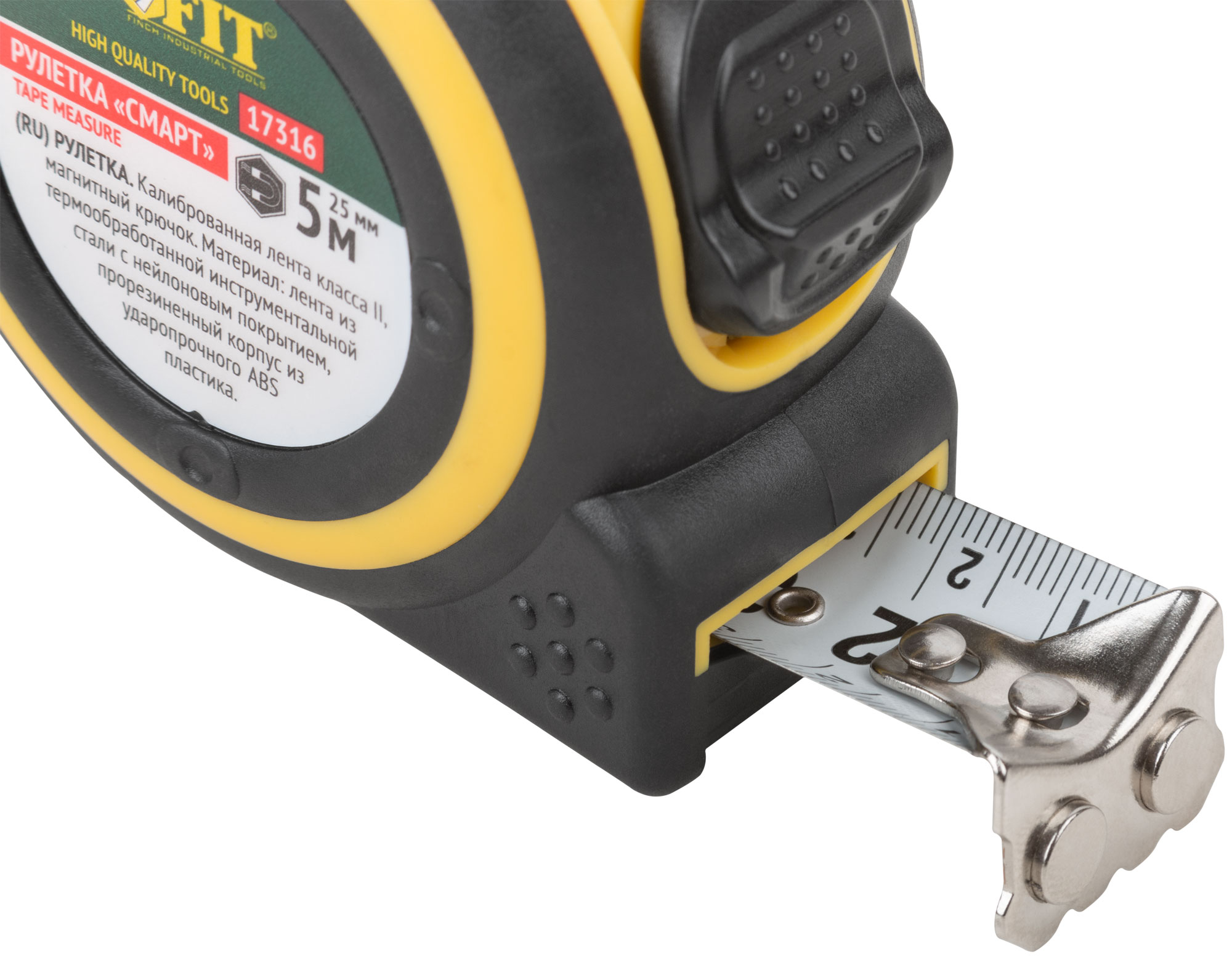 «Смарт». Калиброванная лента класс II, магнитный крючок. Материал: стальная лента с нейлоновым покрытием, прорезиненный корпус из ударопрочного ABS пластика. Упаковка: пластиковый подвес.