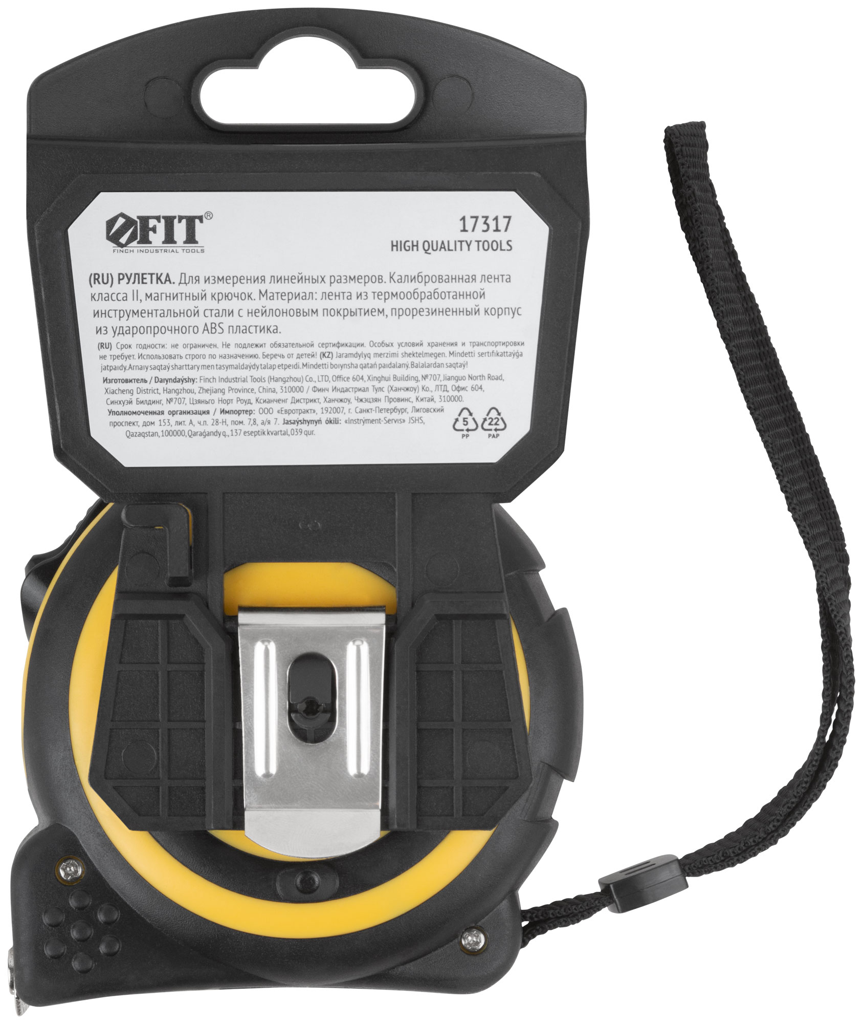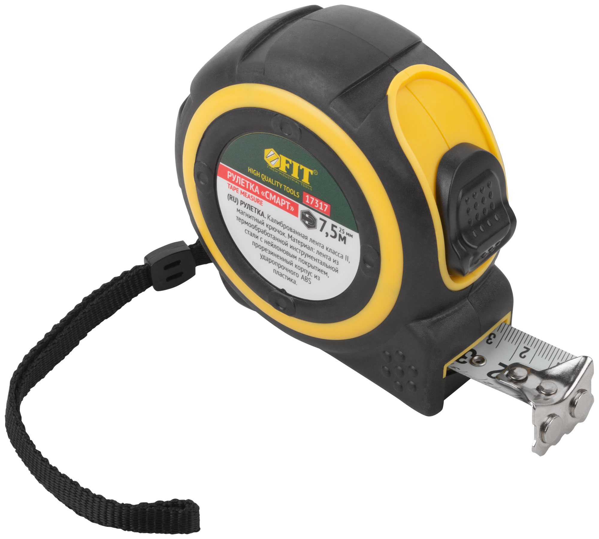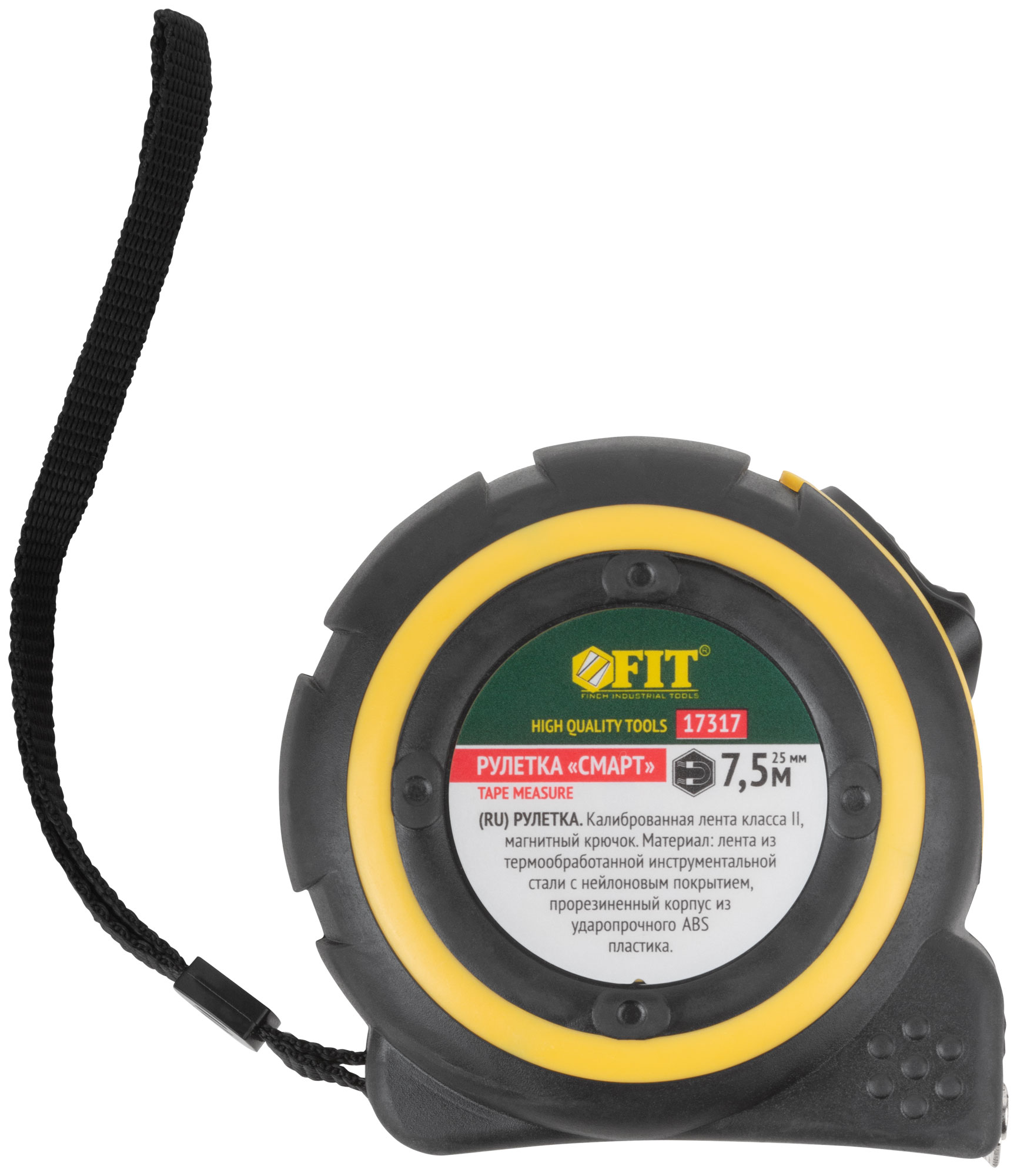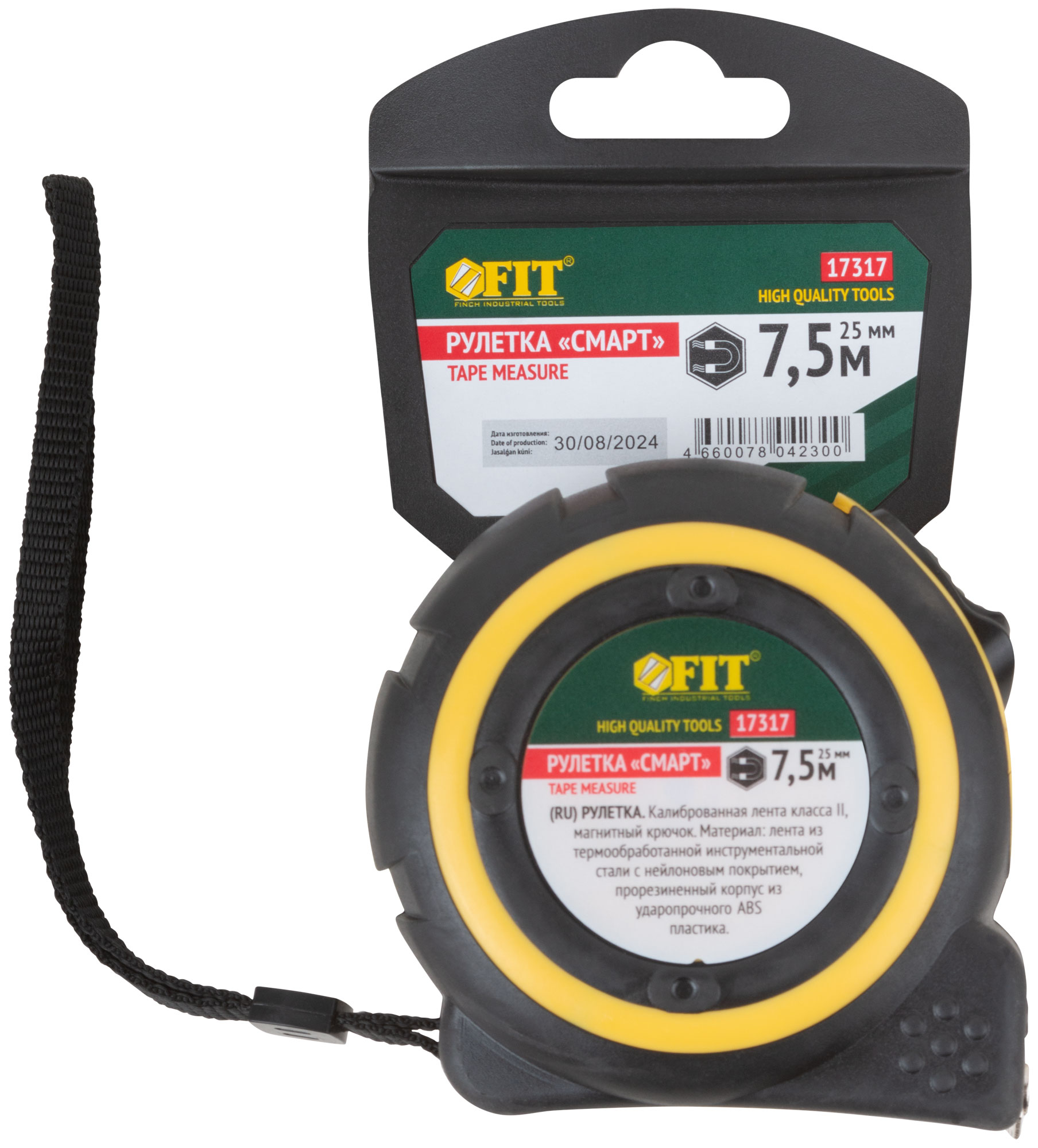 «Смарт». Калиброванная лента класс II, магнитный крючок. Материал: стальная лента с нейлоновым покрытием, прорезиненный корпус из ударопрочного ABS пластика. Упаковка: пластиковый подвес.