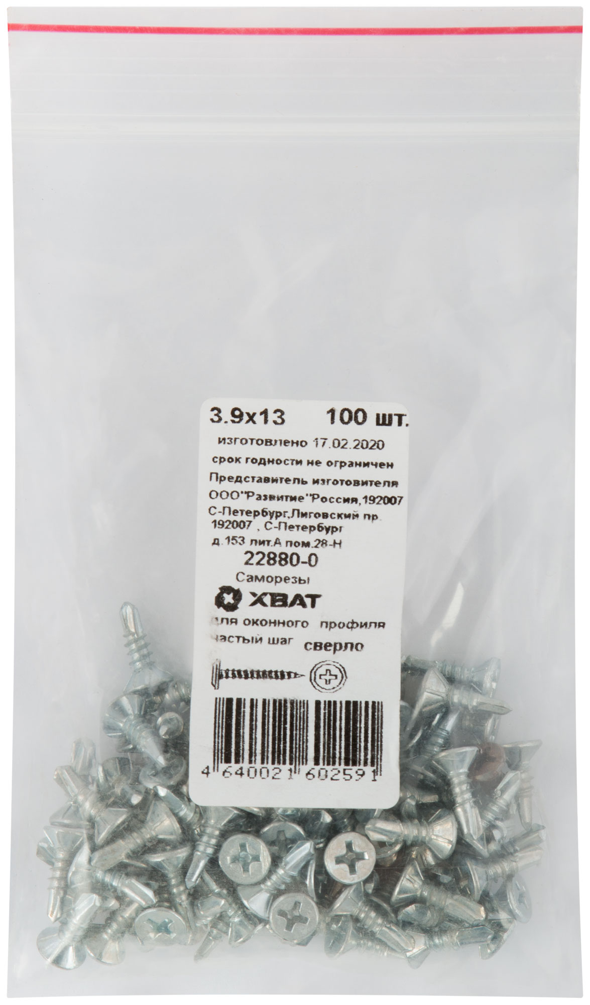 Саморез для оконного профиля частый шаг резьбы, наконечник сверло №2 3.9 х 13 100 шт. Фасовка
