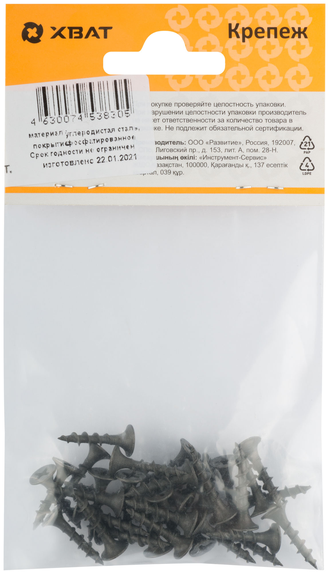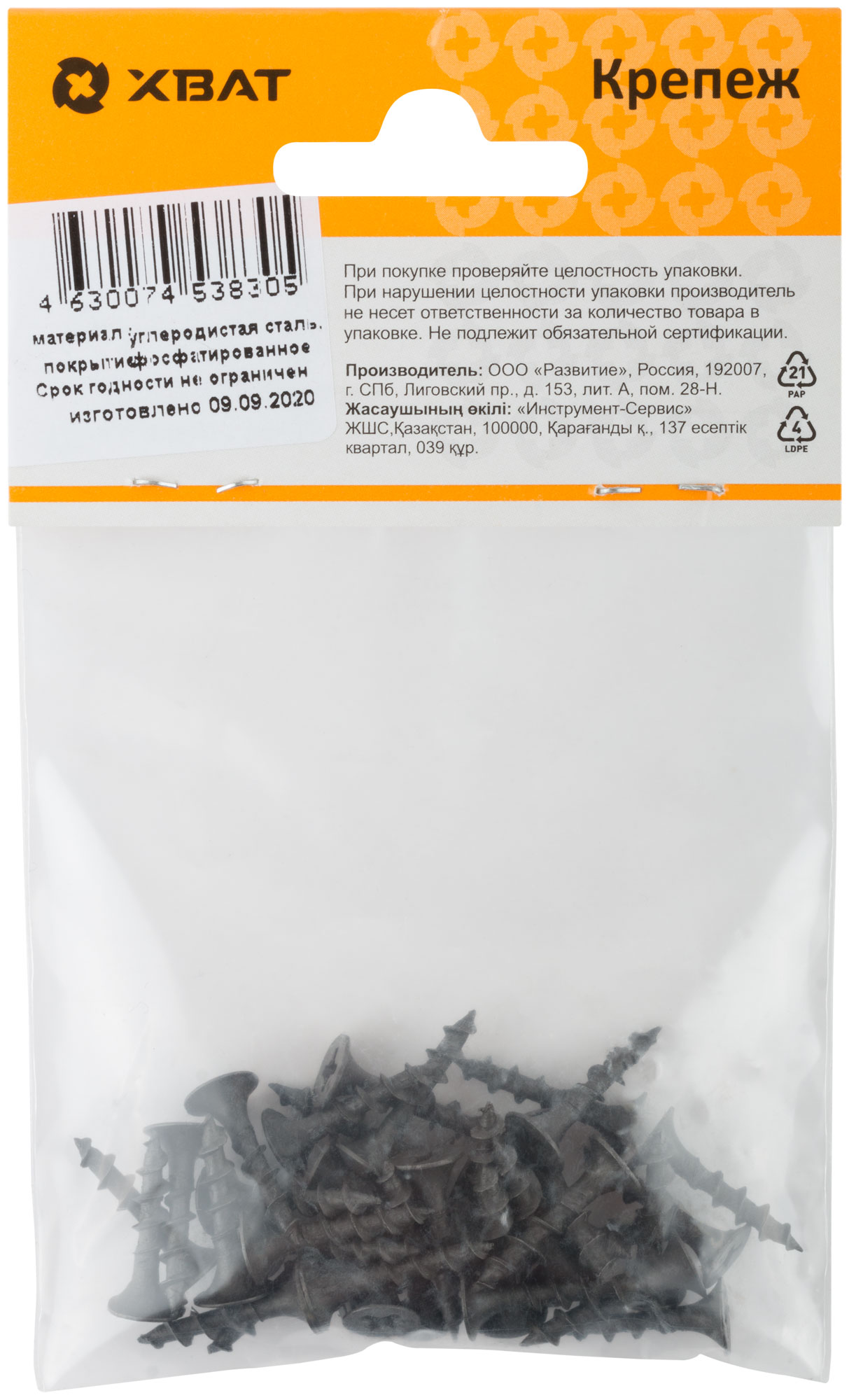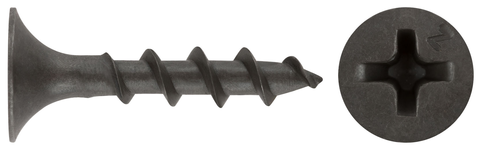 Стальные фосфатированные саморезы с крупной резьбой для монтажа гипсокартонных листов к деревянному основанию. Резьба полная и неполная, потайная головка, шлиц Pн2. Предназначен для крепления материалов к основанию без предварительного сверления.
