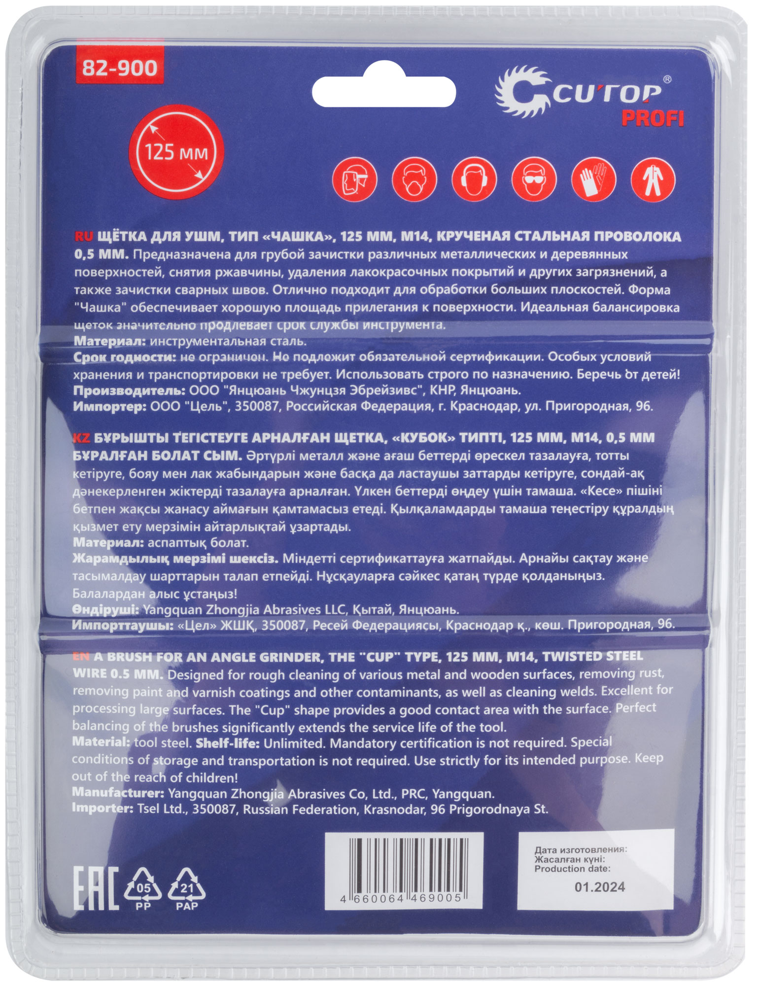 Щетка для УШМ, М14, тип "Чашка", крученая витая проволока 0,5 мм, 125 мм, блистер, CUTOP Profi