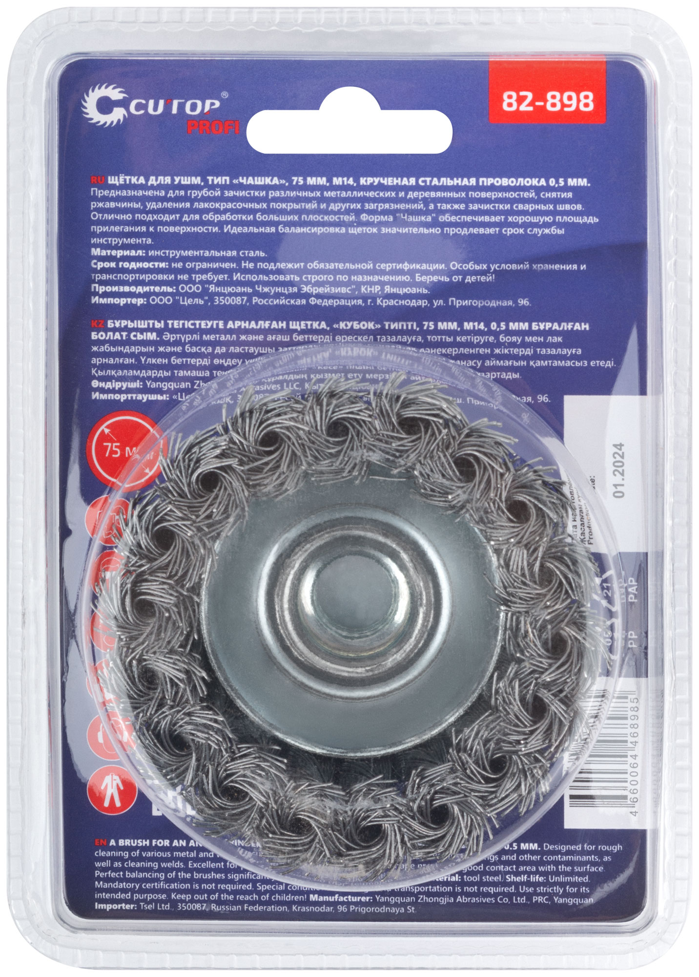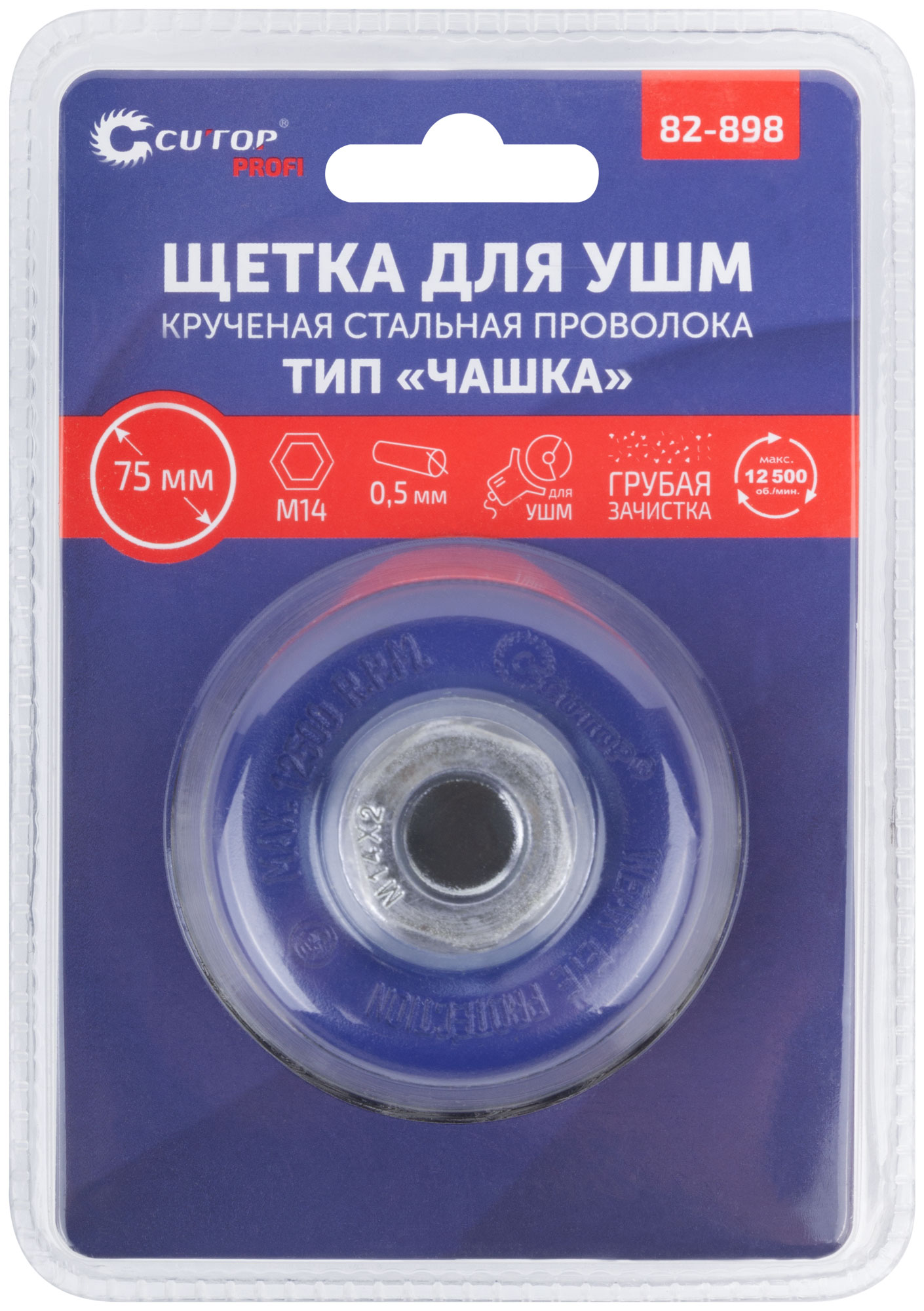Щетка для УШМ, М14, тип "Чашка", крученая витая проволока 0,5 мм, 75 мм, блистер, CUTOP Profi