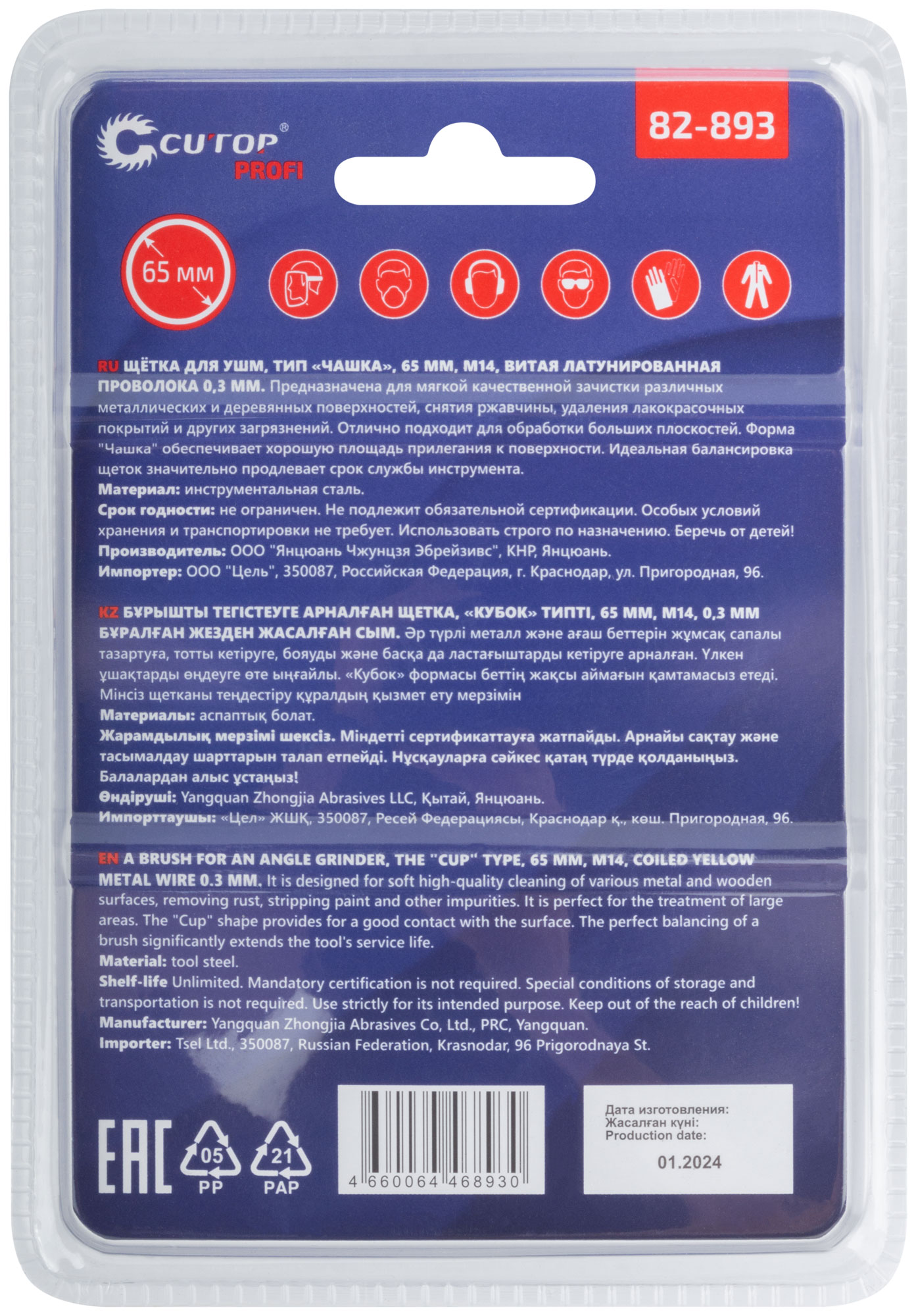 Щетка для УШМ, М14, тип "Чашка", латун. витая проволока 0,3 мм, 65 мм, блистер, CUTOP Profi