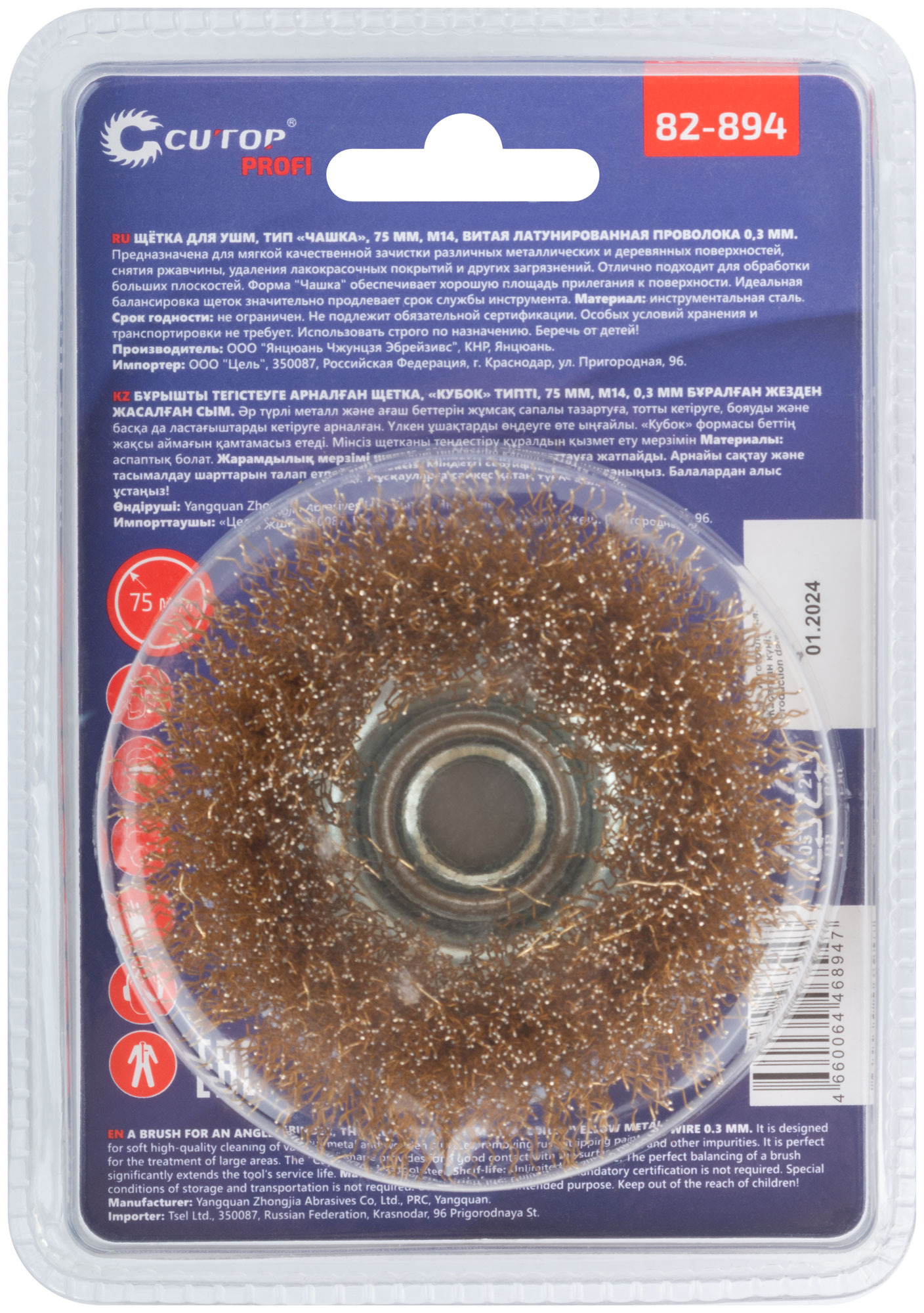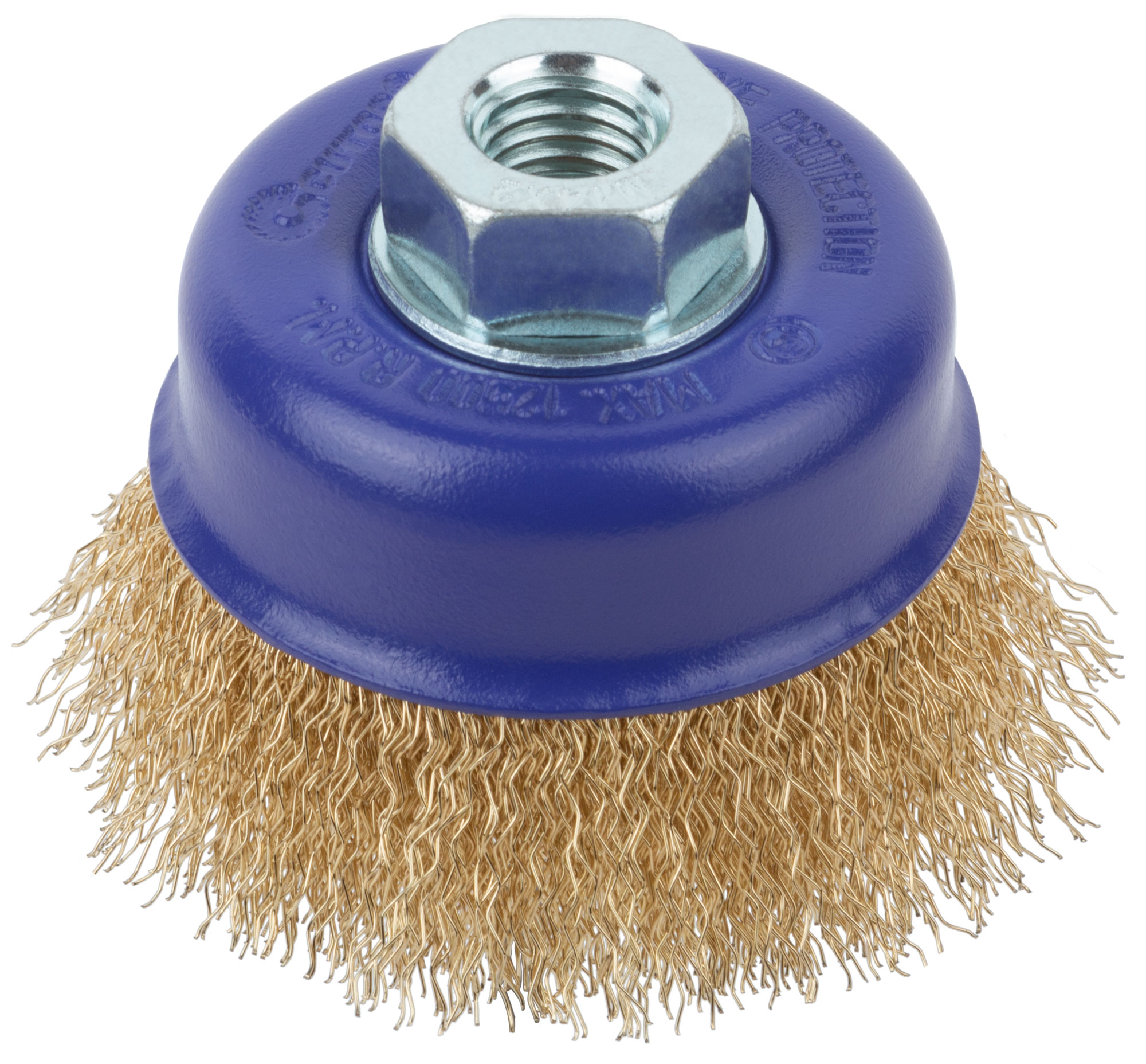 Щетка для УШМ, М14, тип "Чашка", латун. витая проволока 0,3 мм, 75 мм, блистер, CUTOP Profi