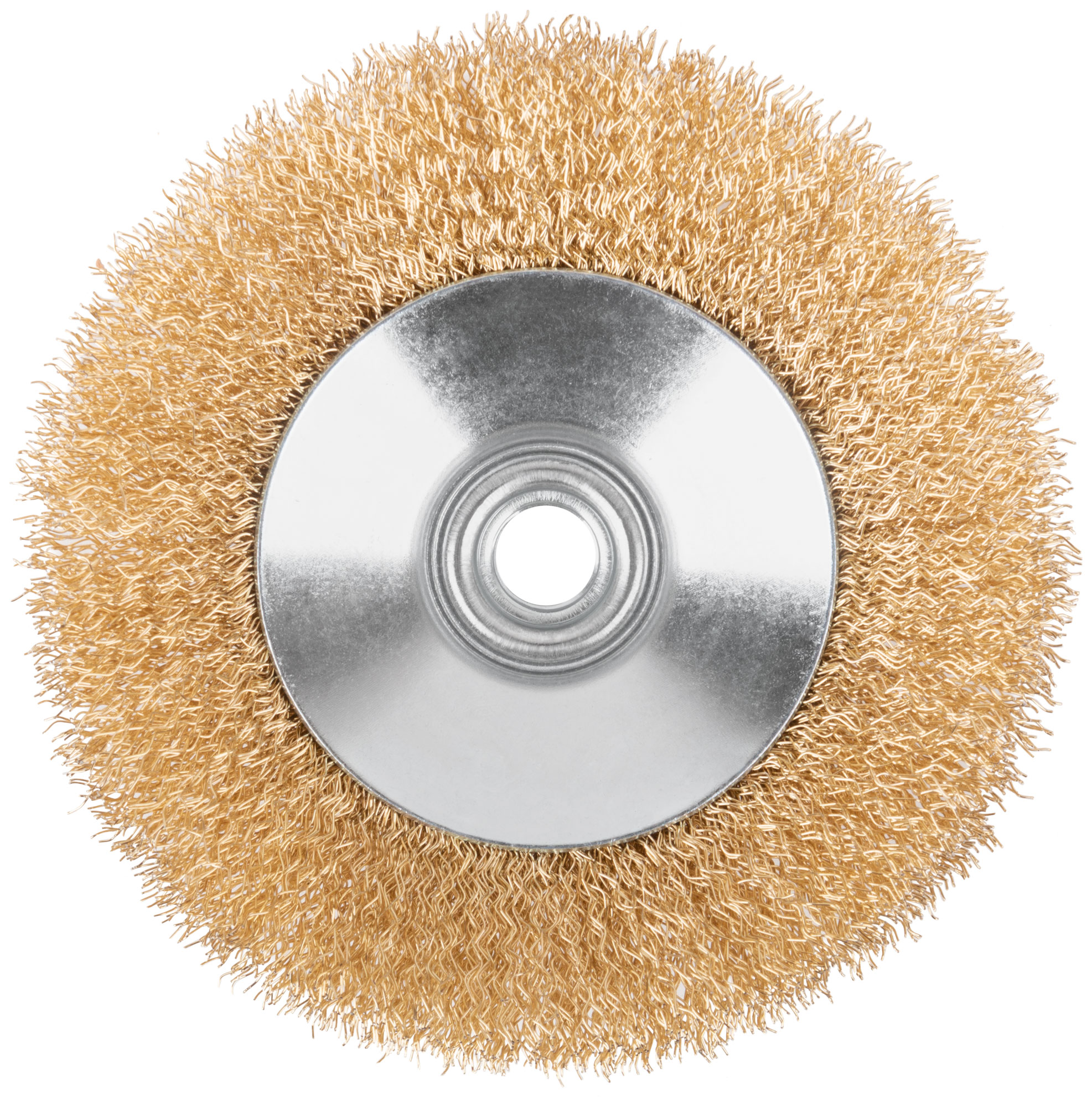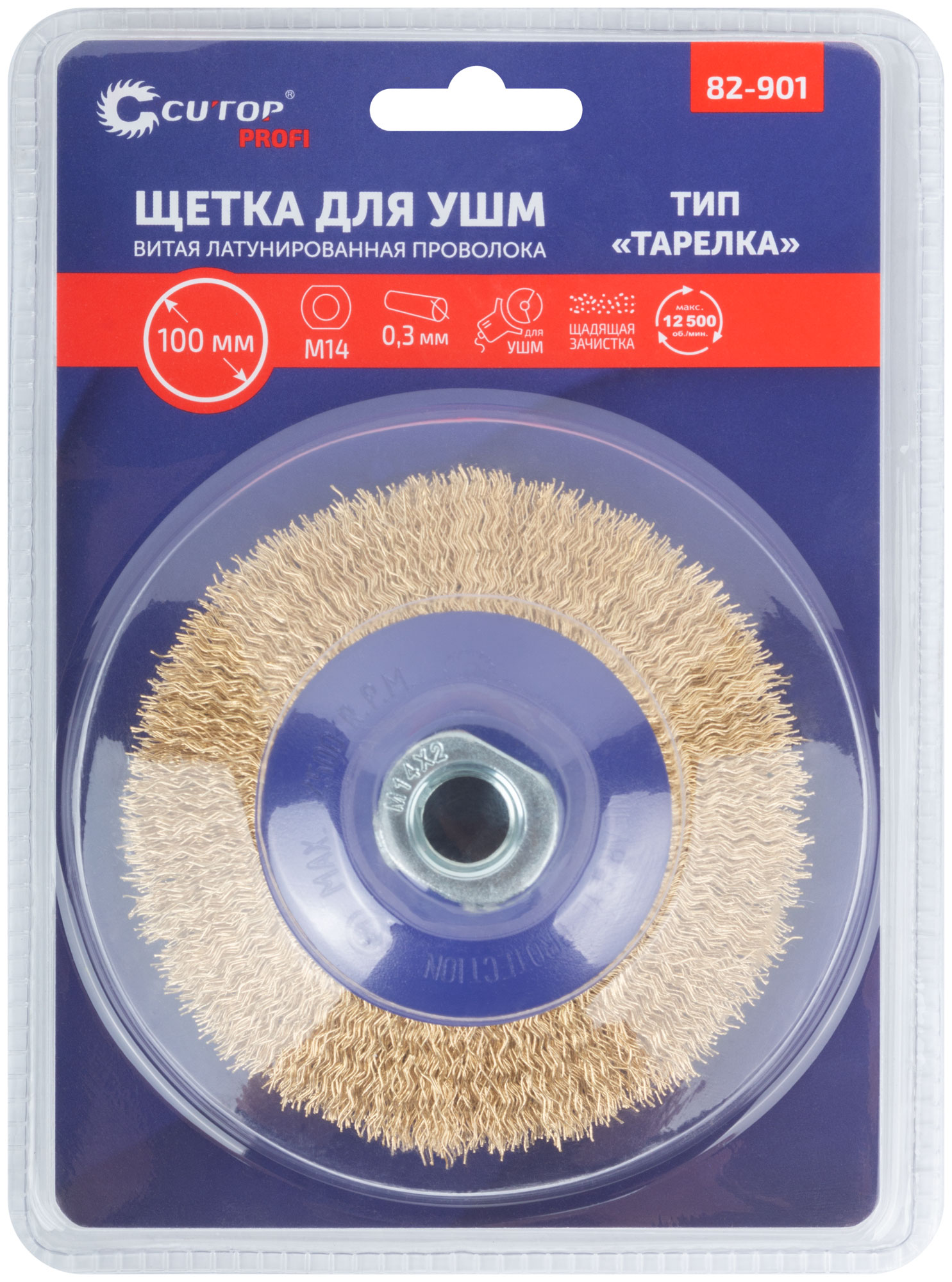 Щетка для УШМ, тип «Тарелка», посадка М14. Предназначена для очистки различных металлических и деревянных поверхностей, снятия толстого слоя ржавчины, удаления лакокрасочных покрытий, заусенцев и окалины, обработки сварных швов, различных загрязнений. Тип «Тарелка» оптимально подходит для обработки углов, пазов, изгибов и других труднодоступных участков. Щадящая зачистка, латунированная проволока 0,3 мм. Упаковка: блистер.