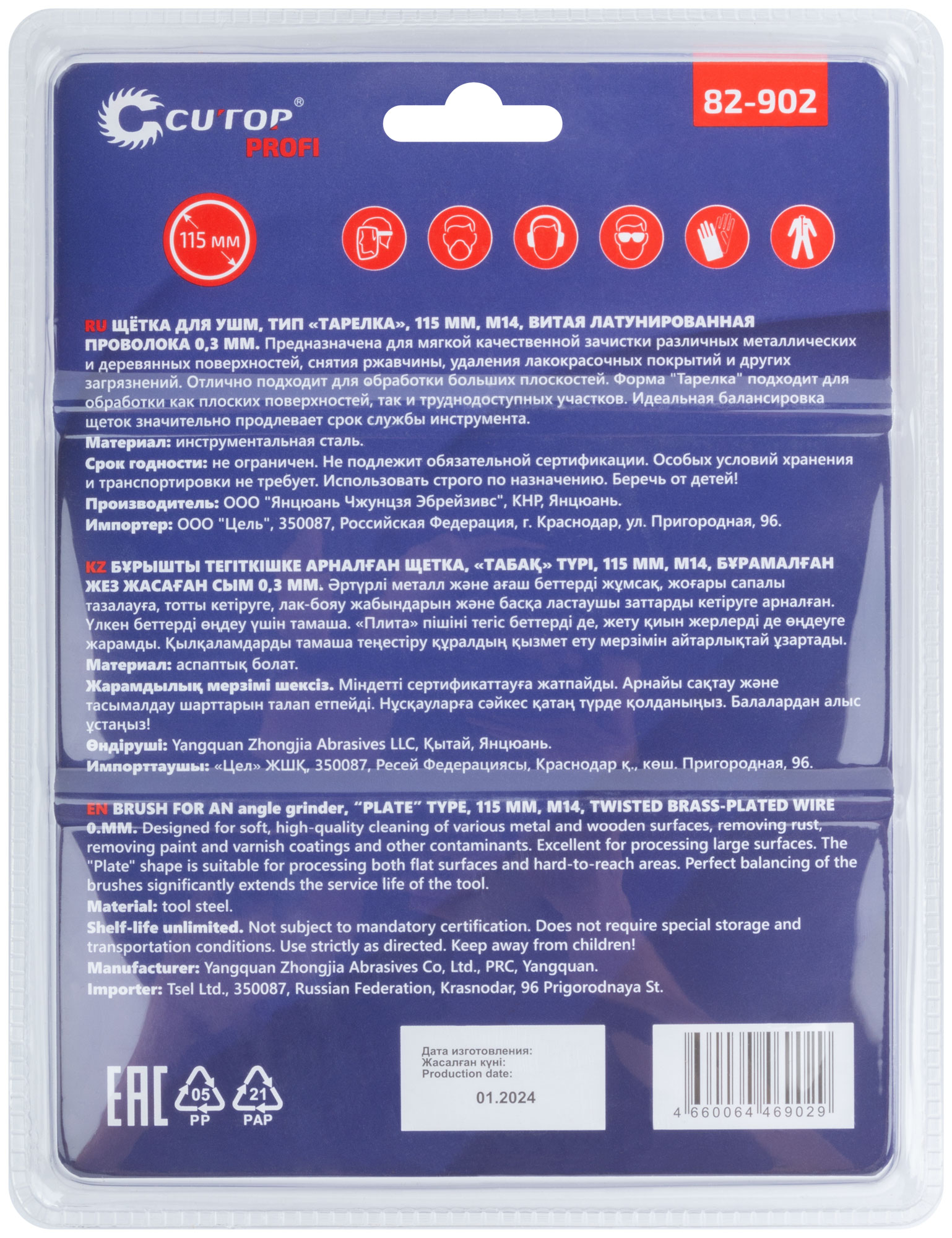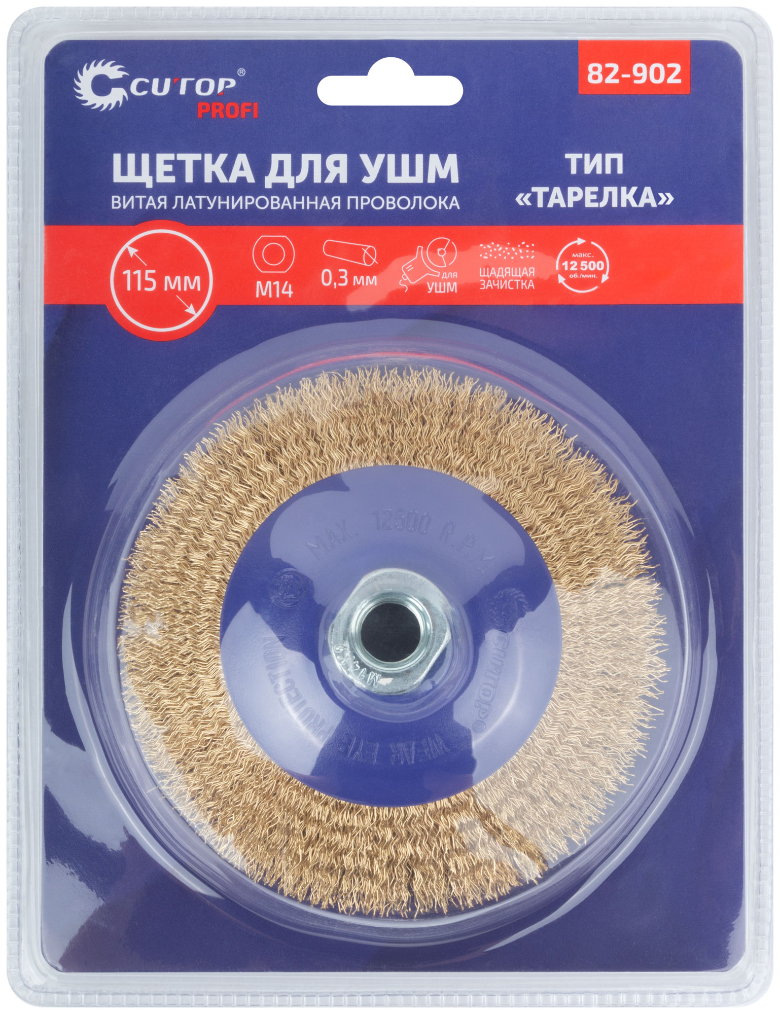 Щетка для УШМ, тип «Тарелка», посадка М14. Предназначена для очистки различных металлических и деревянных поверхностей, снятия толстого слоя ржавчины, удаления лакокрасочных покрытий, заусенцев и окалины, обработки сварных швов, различных загрязнений. Тип «Тарелка» оптимально подходит для обработки углов, пазов, изгибов и других труднодоступных участков. Щадящая зачистка, латунированная проволока 0,3 мм. Упаковка: блистер.