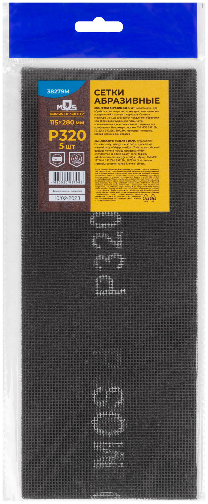 Набор 5 шт. Водостойкие. 115 х 280 мм. Для обработки гипсокартона, штукатурки, металлических поверхностей и прочих материалов. Сетчатая структура меньше забивается продуктами обработки чем абразивная бумага или ткань. Сетки предназначены для использования с терками для шлифования. Материал: полиэфирная ткань, карбид-кремниевый абразив. Упаковка: пакет с подвесом.