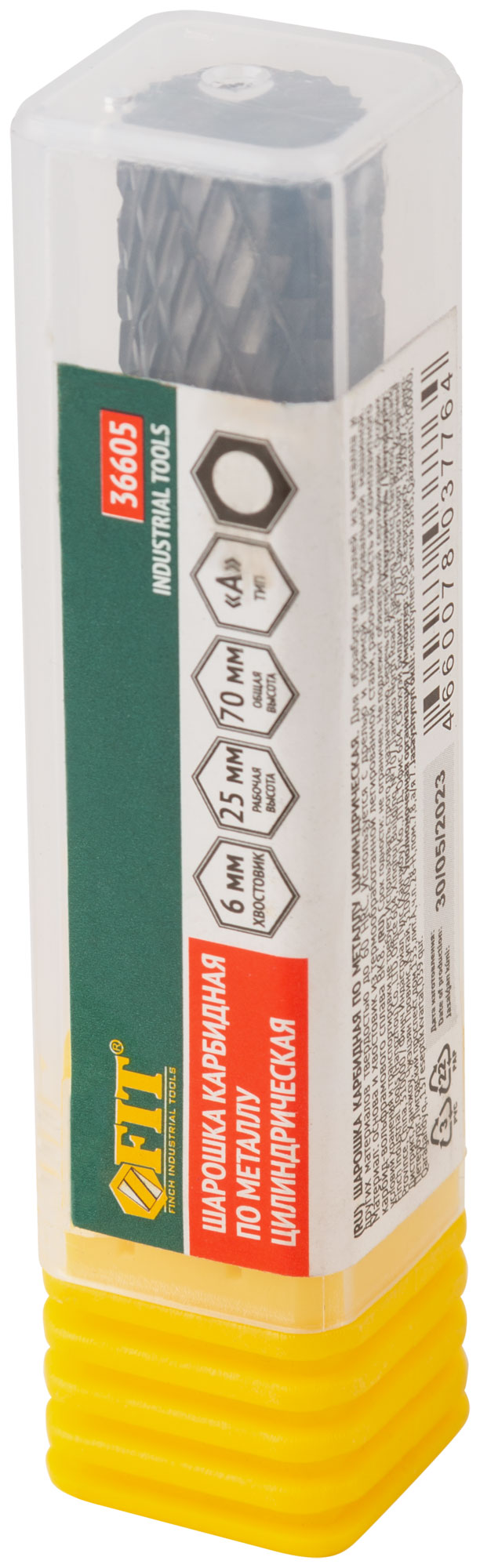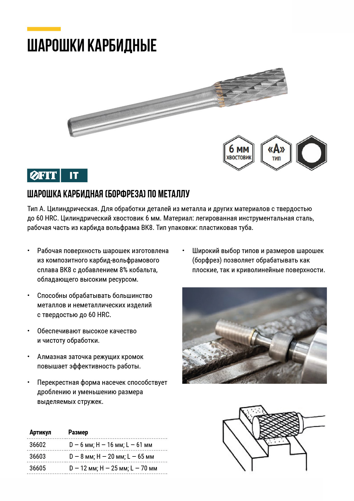 Тип "А". Цилиндрическая. Для обработки деталей из металла и других материалов с твердостью до 60 HRC. Цилиндрический хвостовик 6 мм. Материал: легированная инструментальная сталь, рабочая часть из карбида вольфрама ВК8. Упаковка: пластиковая туба.