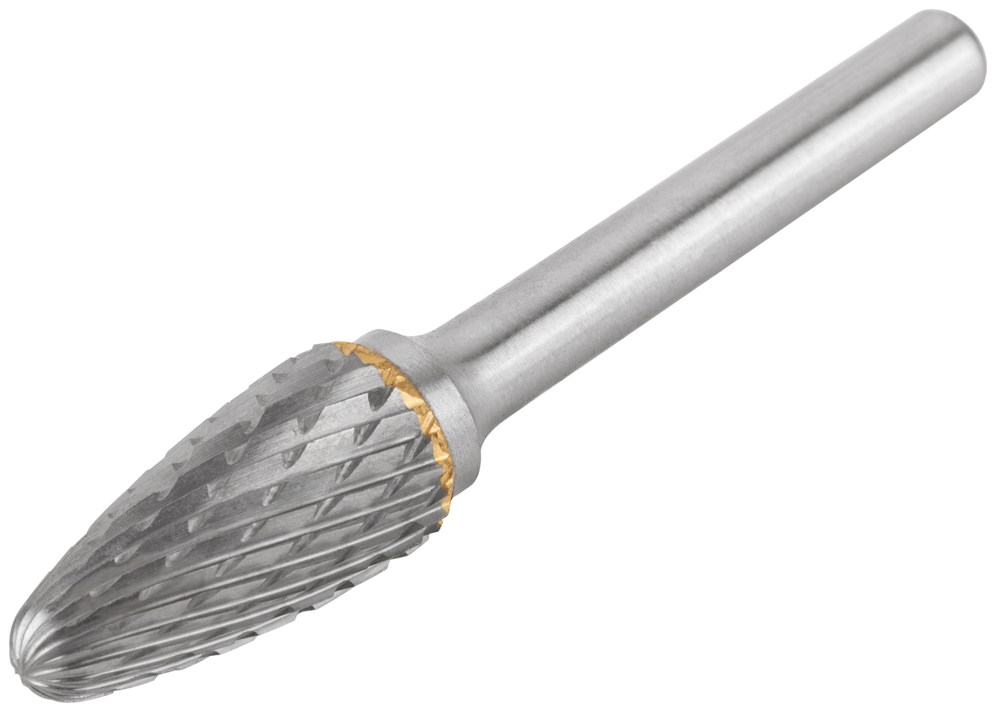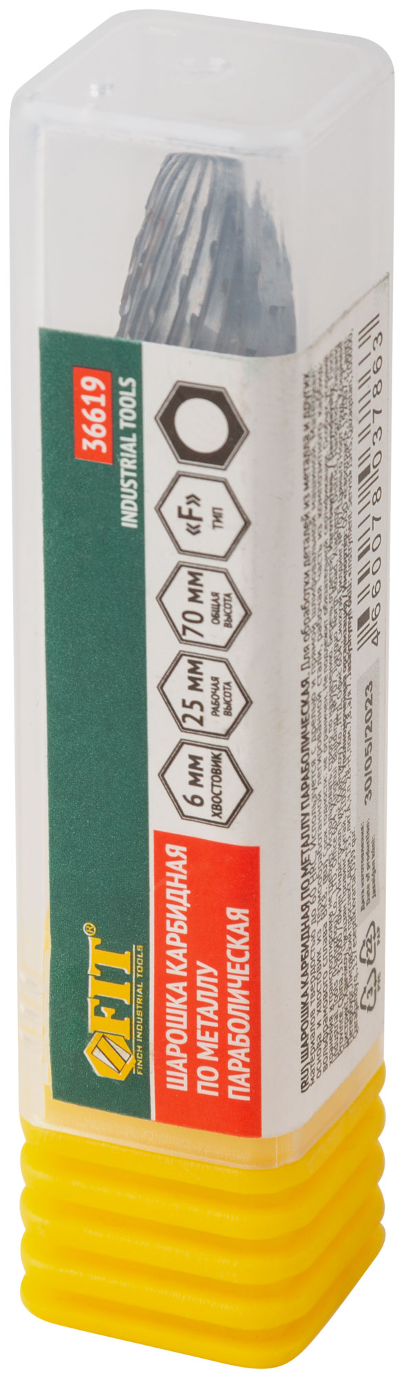 Тип "F". Параболическая. Для обработки деталей из металла и других материалов с твердостью до 60 HRC. Цилиндрический хвостовик 6 мм. Материал: легированная инструментальная сталь, рабочая часть из карбида вольфрама ВК8. Упаковка: пластиковая туба.