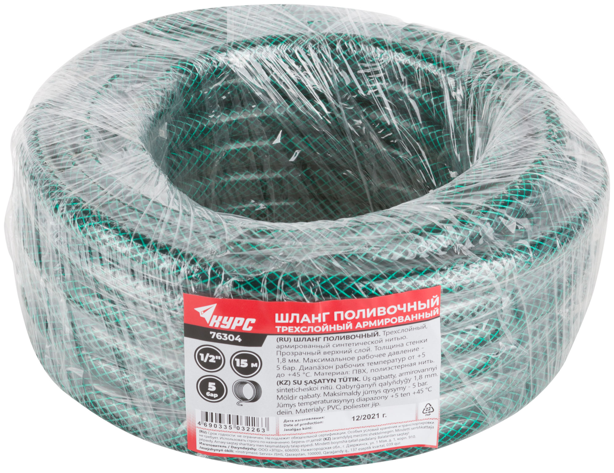 Шланг поливочный трехслойный армированный, зеленый 1/2" х 1,8 мм х 15 м
