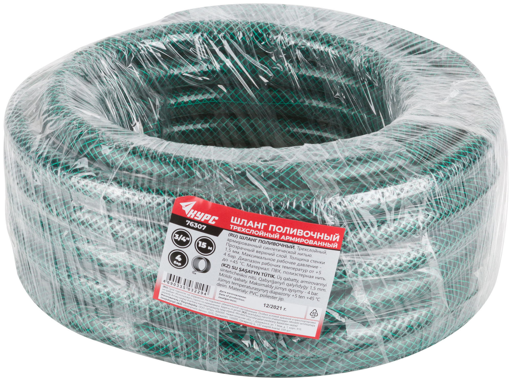 Трехслойный, армированный синтетической нитью. Предназначен для полива, перекачки и прочих работ с жидкостями. Максимальное рабочее давление: 1/2" - 5 бар, 3/4" - 4 бар, 1" - 3 бар. Диапазон рабочих температур от +5 до +40°С. Материал: ПВХ, полиэстерная нить.