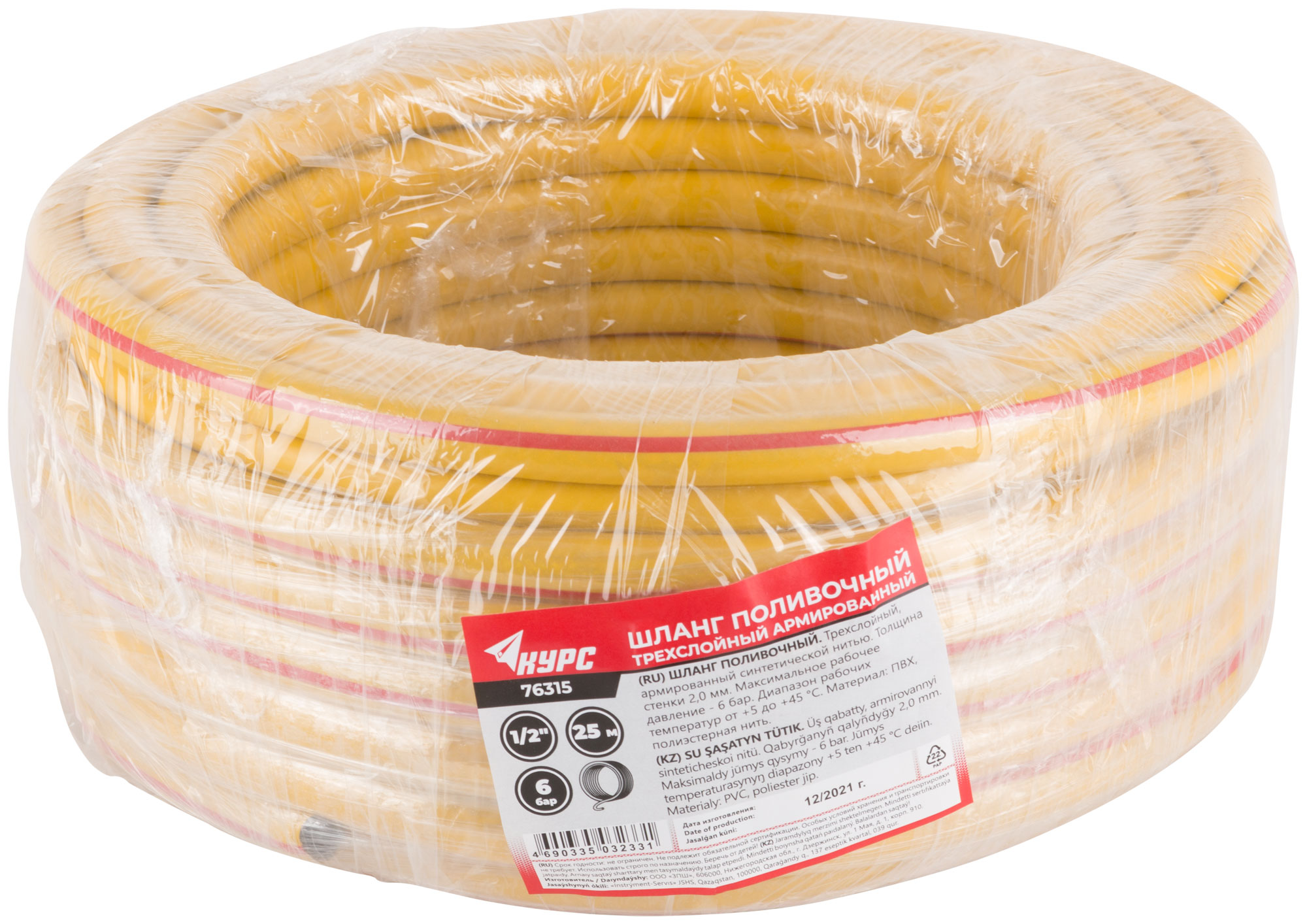 Шланг поливочный трехслойный армированный, желтый 1/2" х 1,9 мм х 25 м