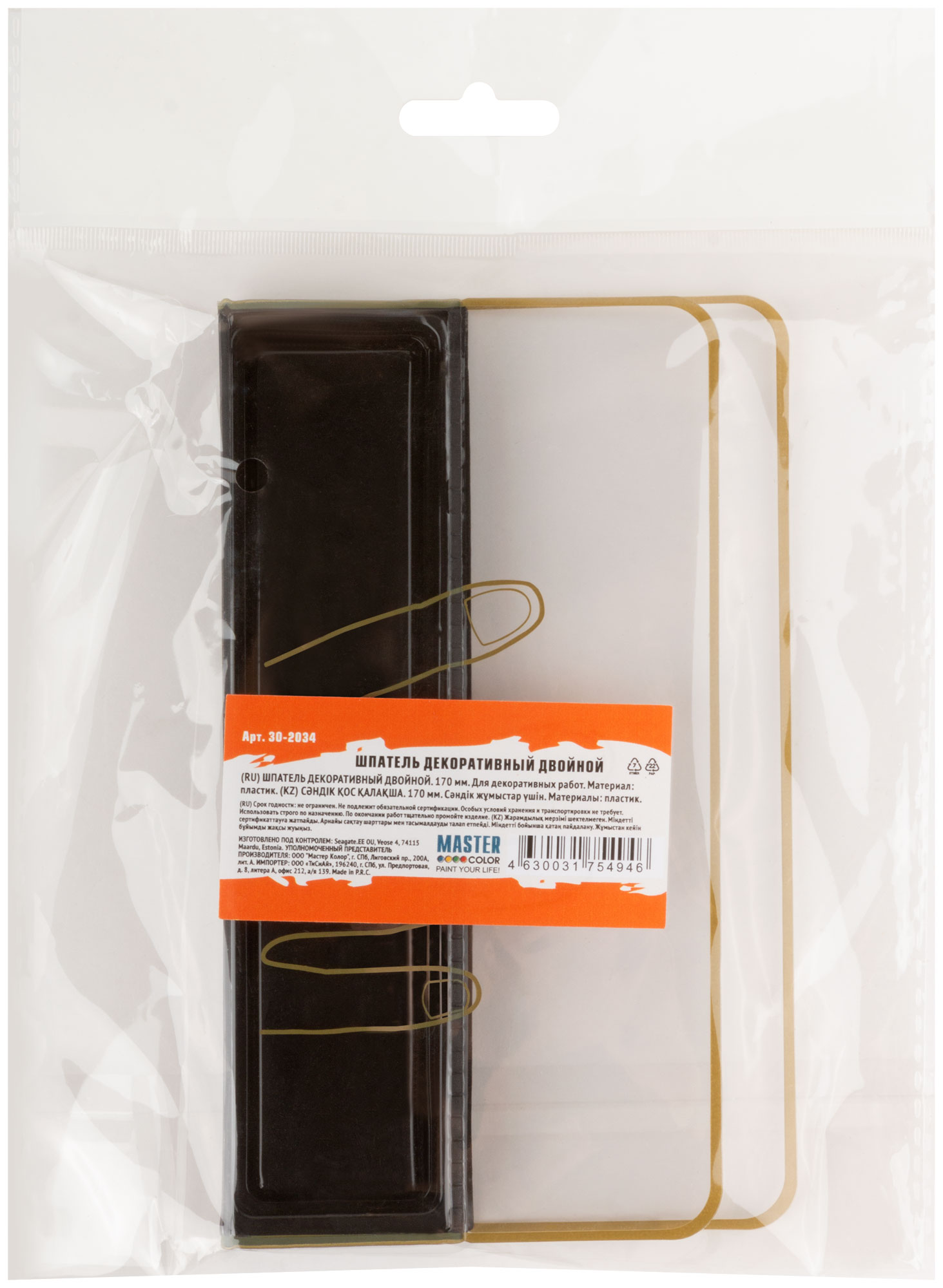 Шпатель декоративный двойной, 170 мм. Предназначен для нанесения декоративных красок (в т.ч. флоковых) и штукатурок. Также применяется для сглаживания верхнего (финишного) слоя и для создания округлой текстуры на финишном покрытии. Благодаря двойной лопатке обеспечивает контролируемое приглаживание финишного материала, контролируя силу нажима при декорировании поверхности.