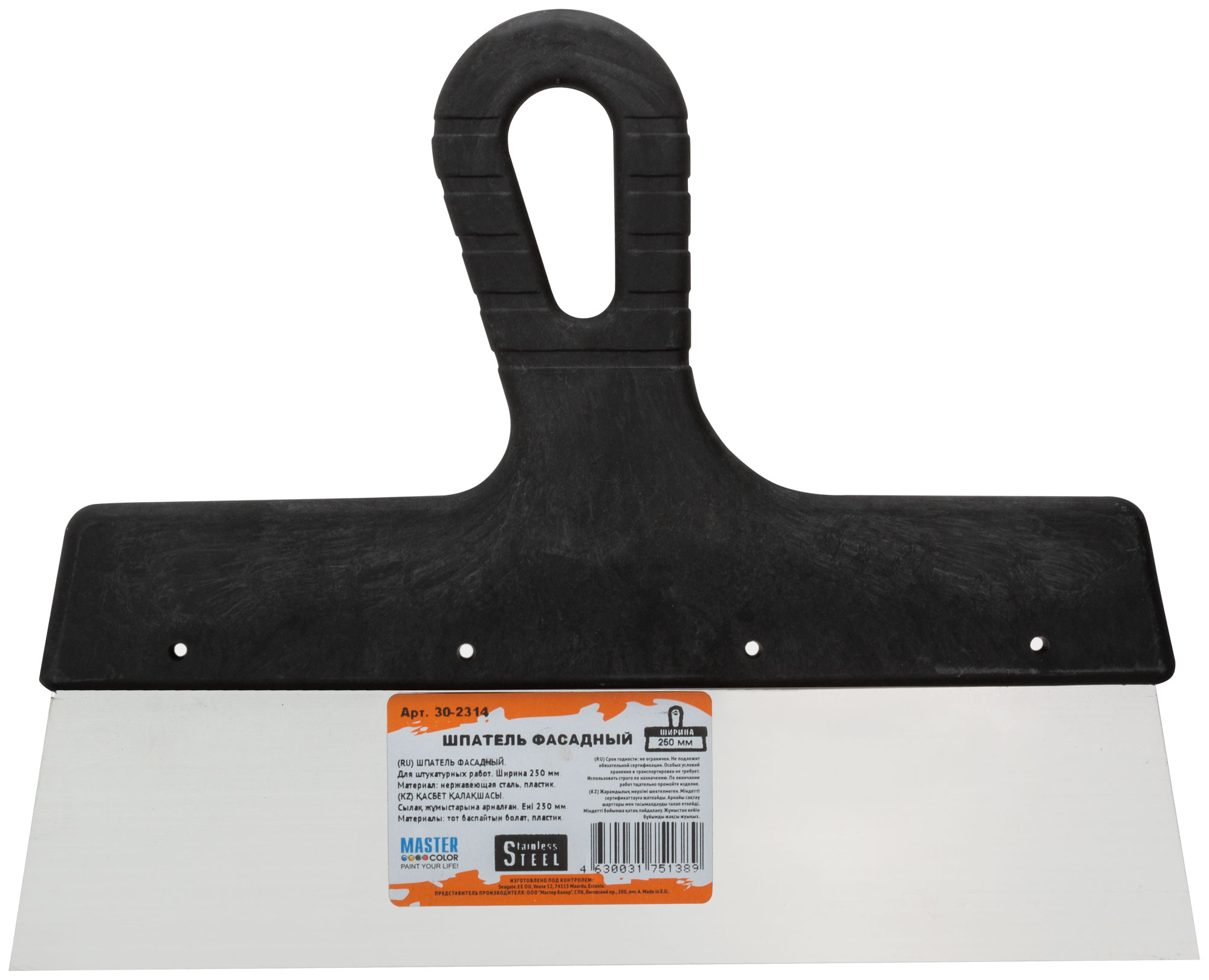 Фасадный шпатель из нержавеющий стали для штукатурных работ. Материал: нержавеющей сталь, пластиковая ручка.