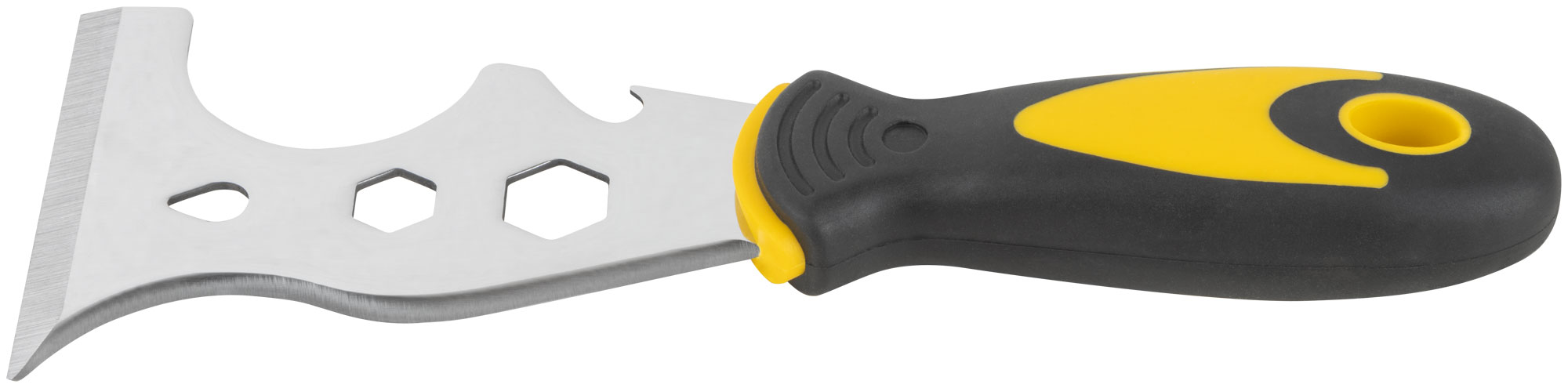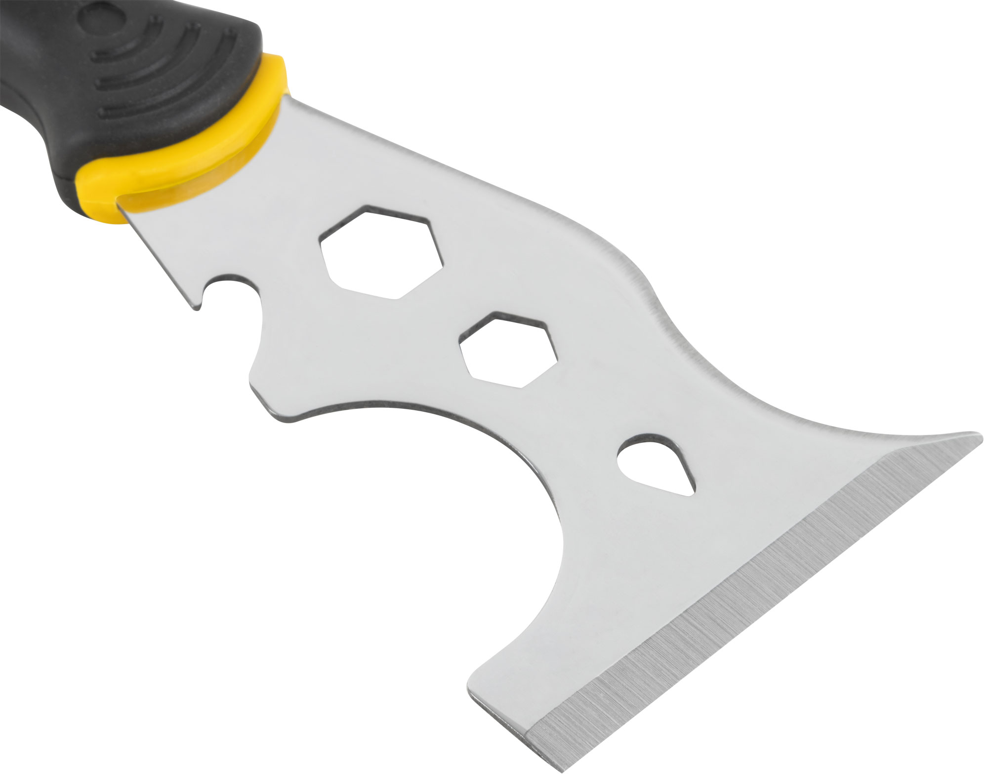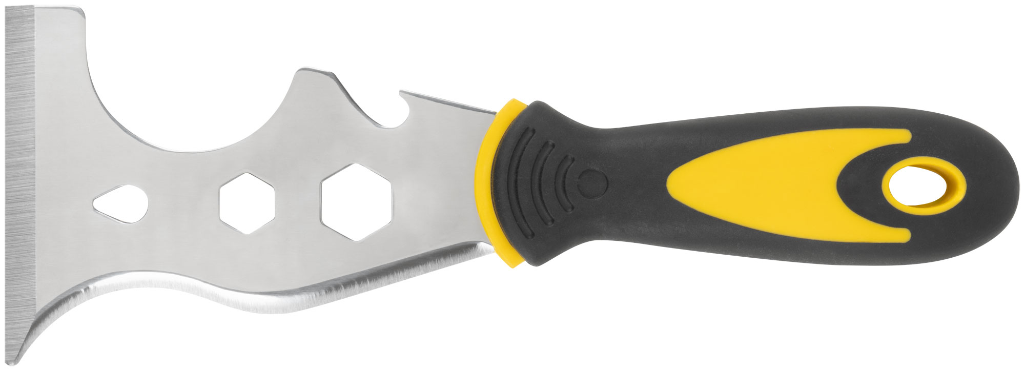 Для зачистки сложных поверхностей, очистки валиков от краски, извлечения гвоздей, открывания банок с краской и прочих работ. Встроенные гаечные ключи 10 и 13 мм. Твердое лезвие из нержавеющей стали, с заточенными гранями, толщина лезвия 1,8-мм, пластиковая прорезиненная ручка.