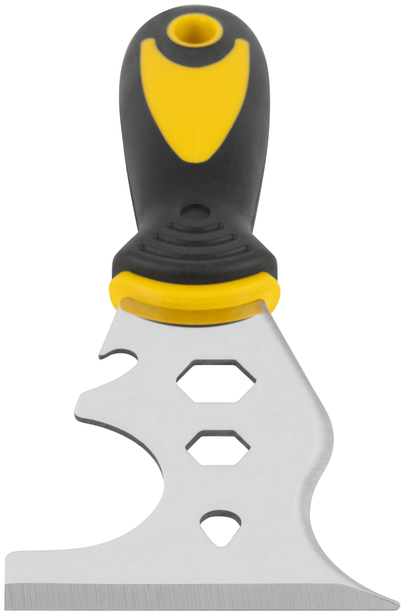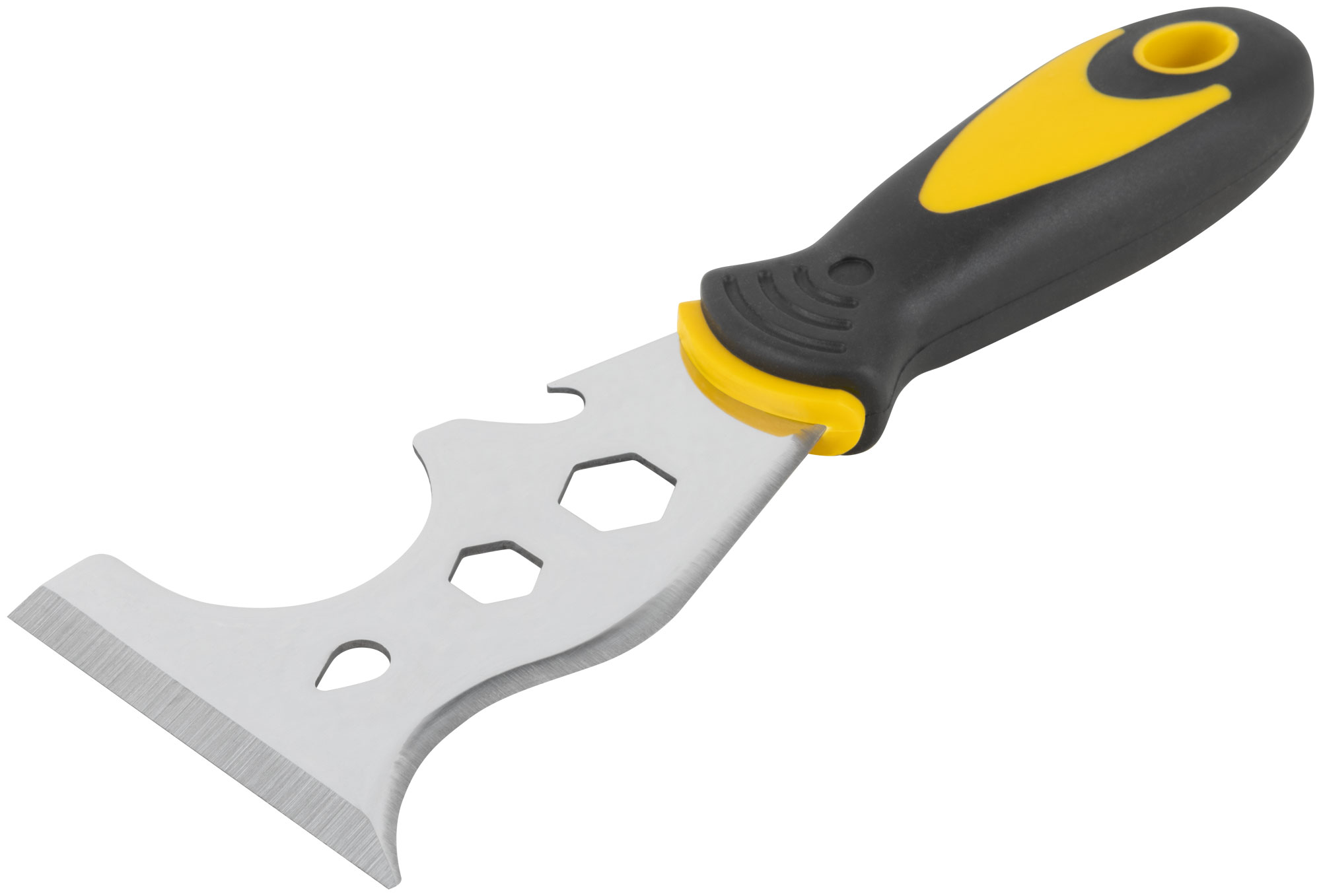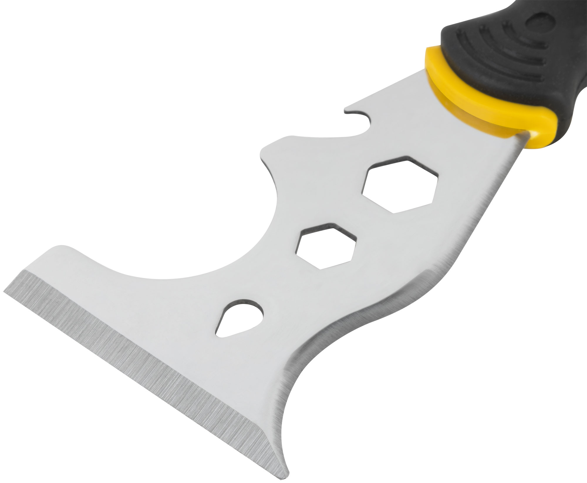 Для зачистки сложных поверхностей, очистки валиков от краски, извлечения гвоздей, открывания банок с краской и прочих работ. Встроенные гаечные ключи 10 и 13 мм. Твердое лезвие из нержавеющей стали, с заточенными гранями, толщина лезвия 1,8-мм, пластиковая прорезиненная ручка.