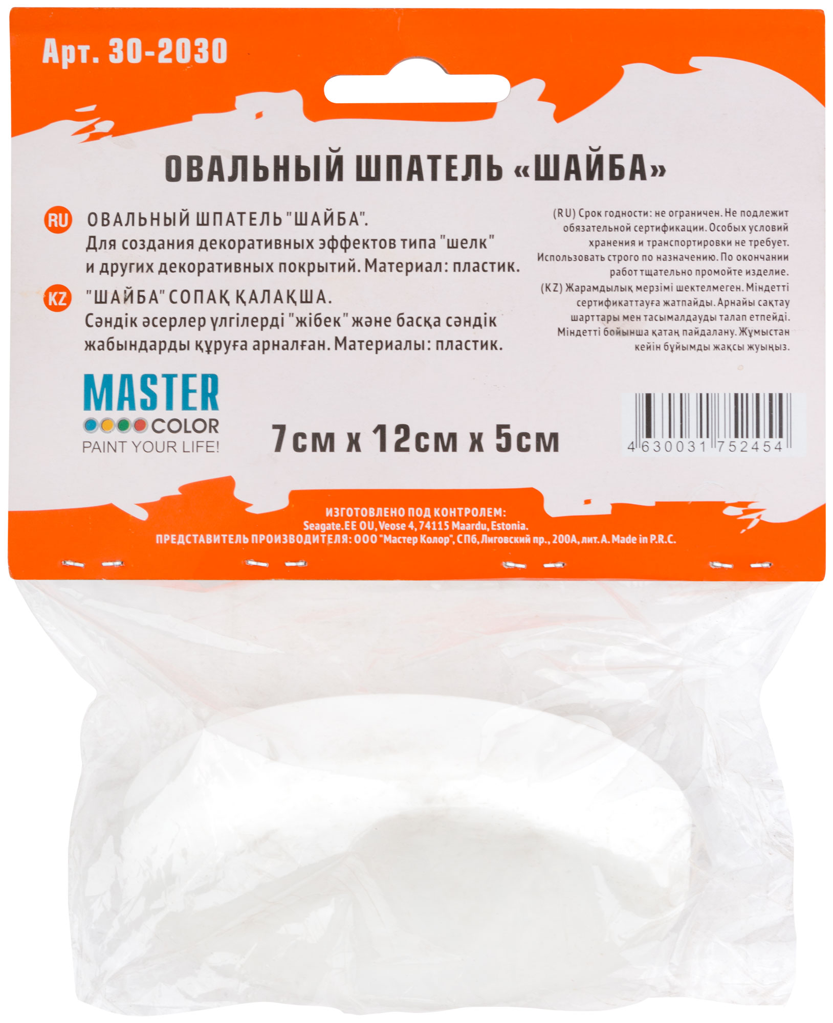 Овальный шпатель «шайба». Специальный инстру-мент для нанесения жидких декоративных красок и покрытий. Благодаря особой форме рабочей поверхности, позволяет формировать рисунки с различными эффектами. Материал: пластик.