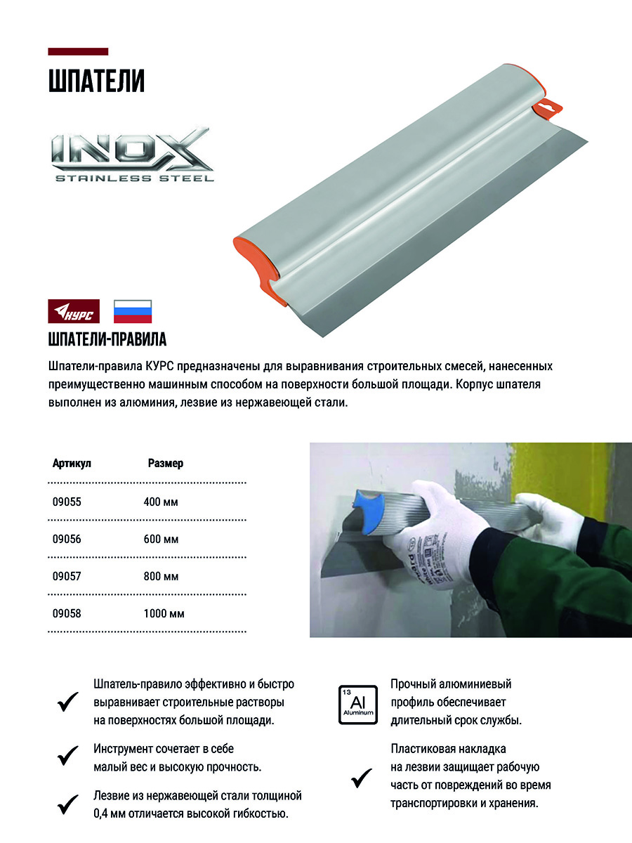 Для выравнивания строительных смесей, нанесенных преимущественно машинным способом, на поверхностях большой площади.Материал: корпус из алюминия, лезвие из-нержавеющей стали.