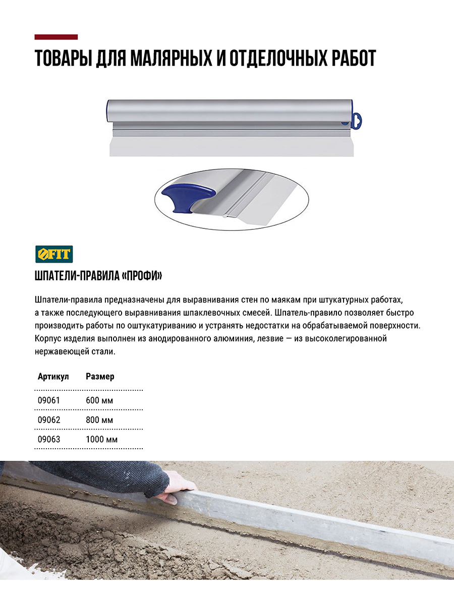 Профи. Для выравнивания строительных смесей, нанесенных преимущественно машинным способом, на поверхностях большой площади. Материал: корпус из анодированного алюминия, лезвие из высоколегированной нержавеющей стали.