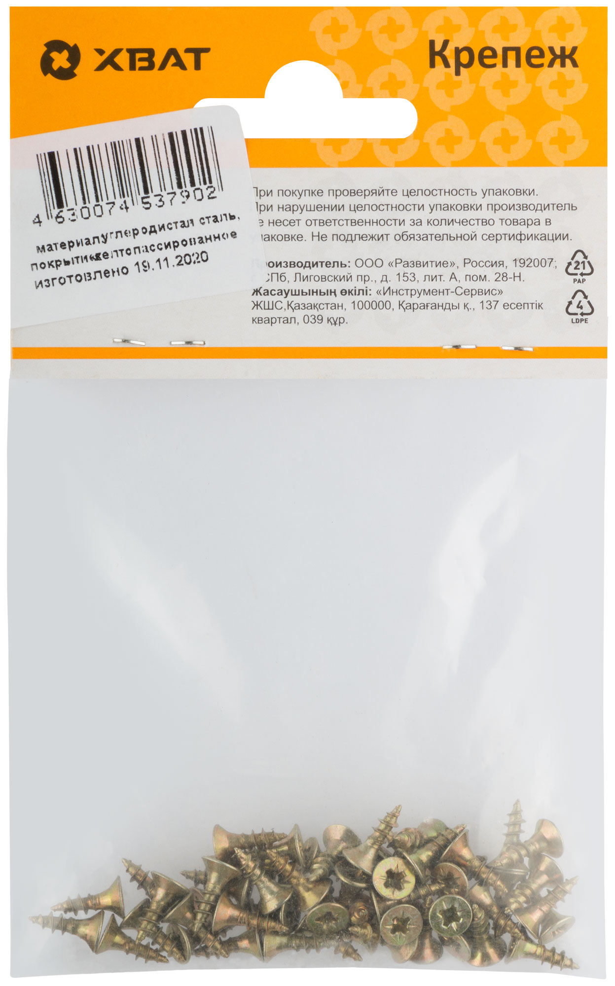 Универсальные стальные оцинкованные (жёлтый цвет) саморезы применяются для крепления к различным материалам: дерево, ДСП, пластмасса, тонкие металлические листы без предварительного сверления. Резьба полная и неполная, потайная головка, шлиц Pz1 (если диаметр самореза от 2,5 до 3мм), шлиц Pz2 (если диаметр самореза от 3,5 до 5мм), шлиц Pz3 (если диаметр самореза 6мм). Широко используется для установки в дюбели при монтаже в бетон, кирпич и т.п.