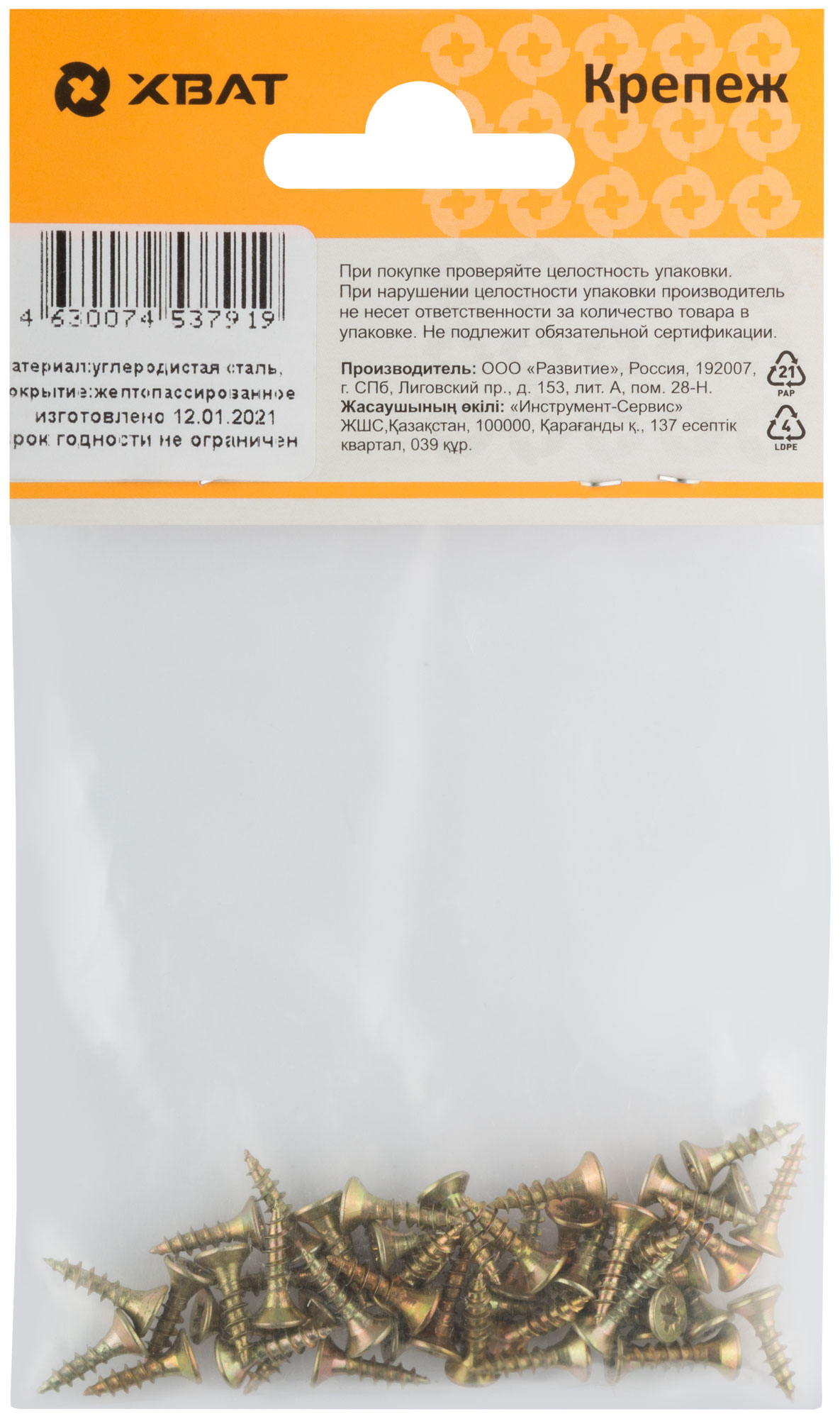 Универсальные стальные оцинкованные (жёлтый цвет) саморезы применяются для крепления к различным материалам: дерево, ДСП, пластмасса, тонкие металлические листы без предварительного сверления. Резьба полная и неполная, потайная головка, шлиц Pz1 (если диаметр самореза от 2,5 до 3мм), шлиц Pz2 (если диаметр самореза от 3,5 до 5мм), шлиц Pz3 (если диаметр самореза 6мм). Широко используется для установки в дюбели при монтаже в бетон, кирпич и т.п.