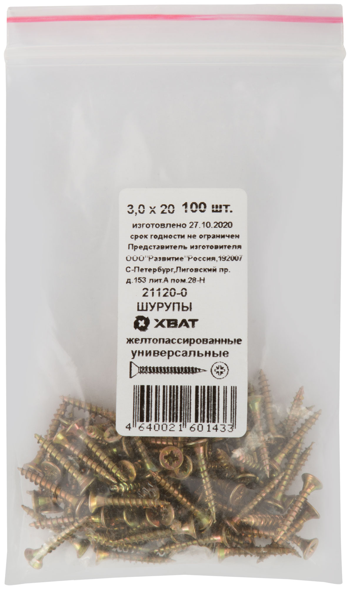 Шурупы желтопассированные, универсальные 3 х 20 100 шт Фасовка