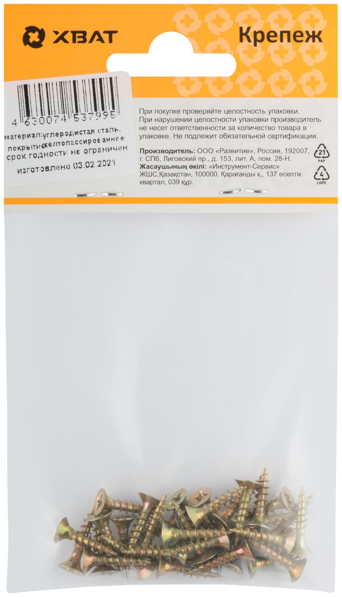 Универсальные стальные оцинкованные (жёлтый цвет) саморезы применяются для крепления к различным материалам: дерево, ДСП, пластмасса, тонкие металлические листы без предварительного сверления. Резьба полная и неполная, потайная головка, шлиц Pz1 (если диаметр самореза от 2,5 до 3мм), шлиц Pz2 (если диаметр самореза от 3,5 до 5мм), шлиц Pz3 (если диаметр самореза 6мм). Широко используется для установки в дюбели при монтаже в бетон, кирпич и т.п.
