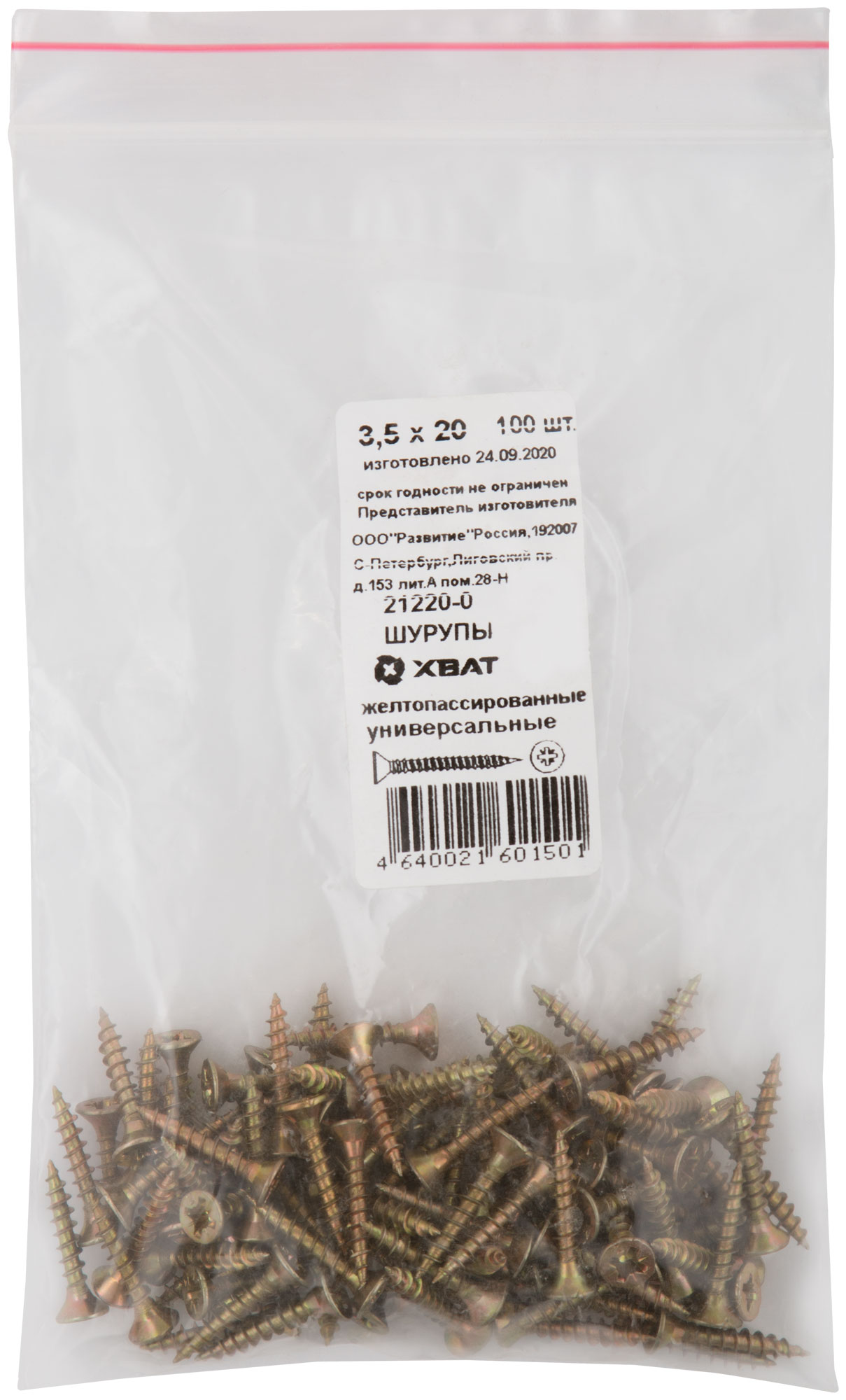 Шурупы желтопассированные, универсальные 3,5 х 20 100 шт Фасовка
