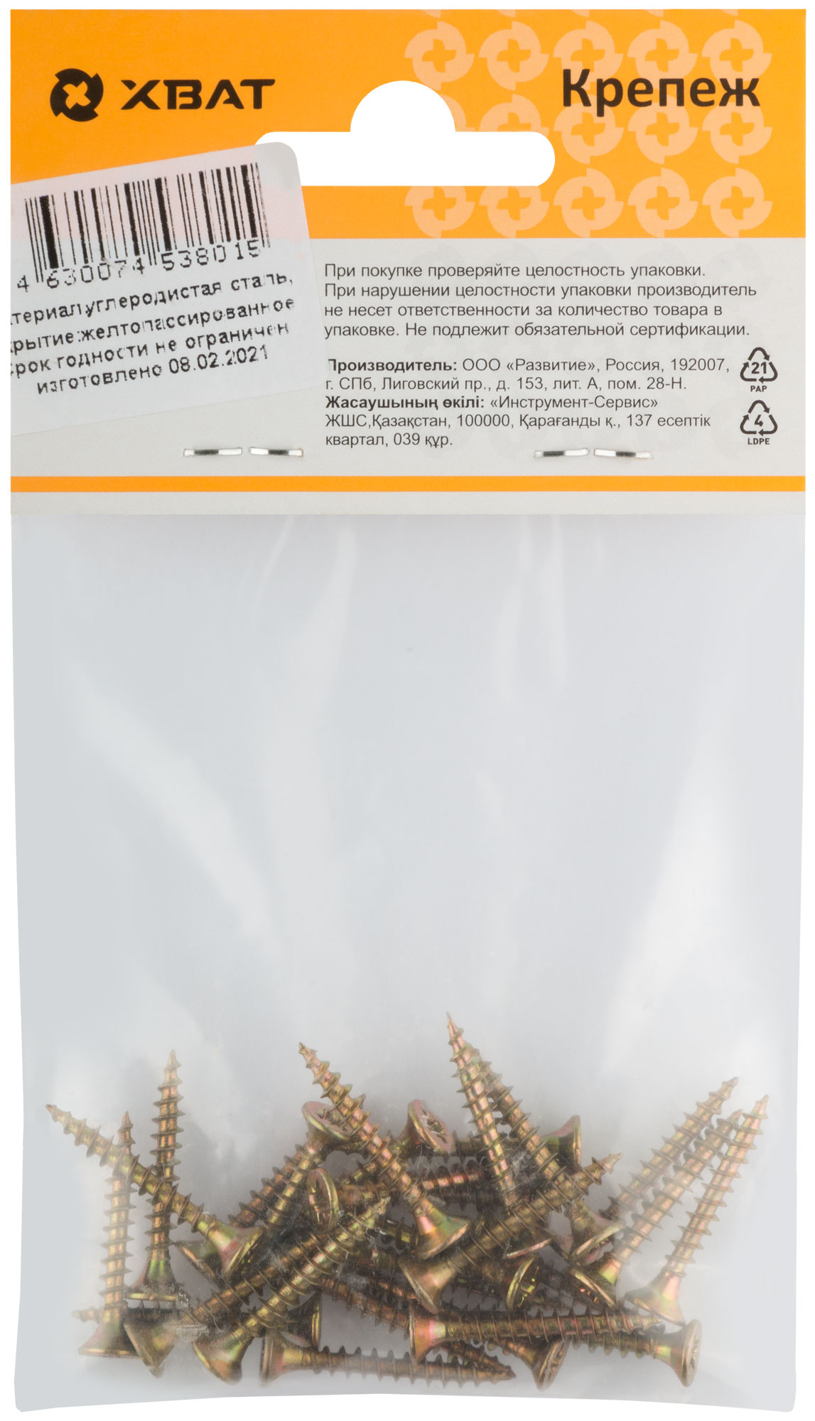 Универсальные стальные оцинкованные (жёлтый цвет) саморезы применяются для крепления к различным материалам: дерево, ДСП, пластмасса, тонкие металлические листы без предварительного сверления. Резьба полная и неполная, потайная головка, шлиц Pz1 (если диаметр самореза от 2,5 до 3мм), шлиц Pz2 (если диаметр самореза от 3,5 до 5мм), шлиц Pz3 (если диаметр самореза 6мм). Широко используется для установки в дюбели при монтаже в бетон, кирпич и т.п.