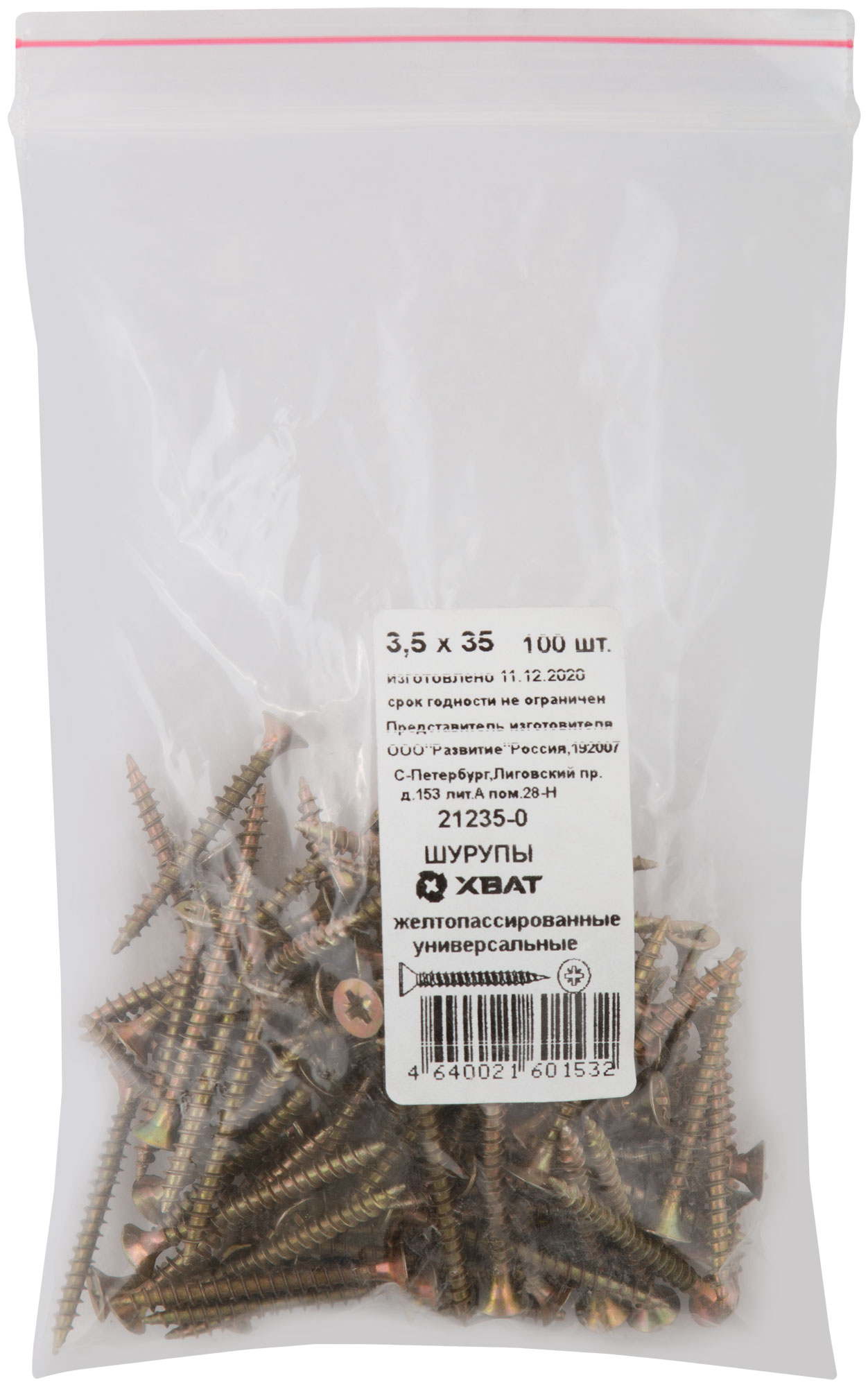 Шурупы желтопассированные, универсальные 3,5 х 35 100 шт Фасовка