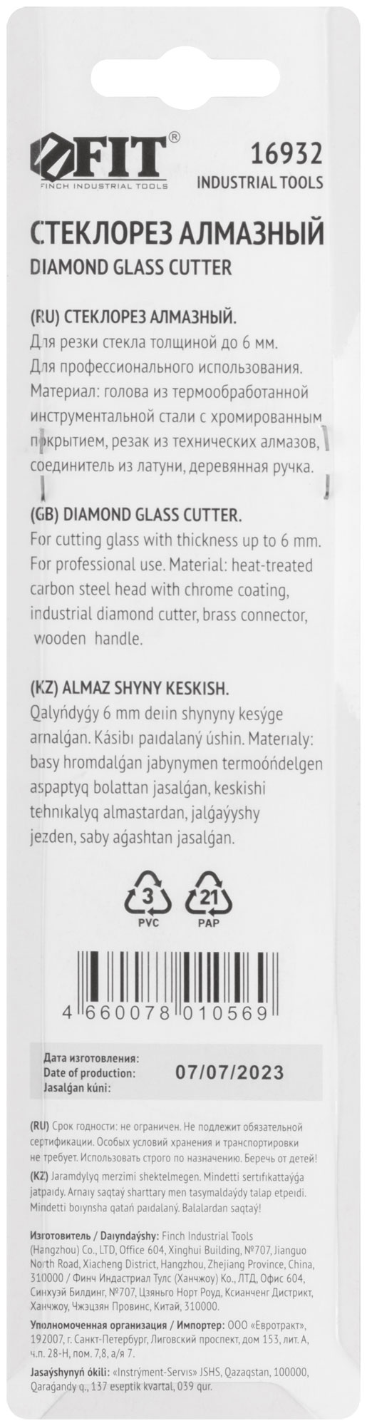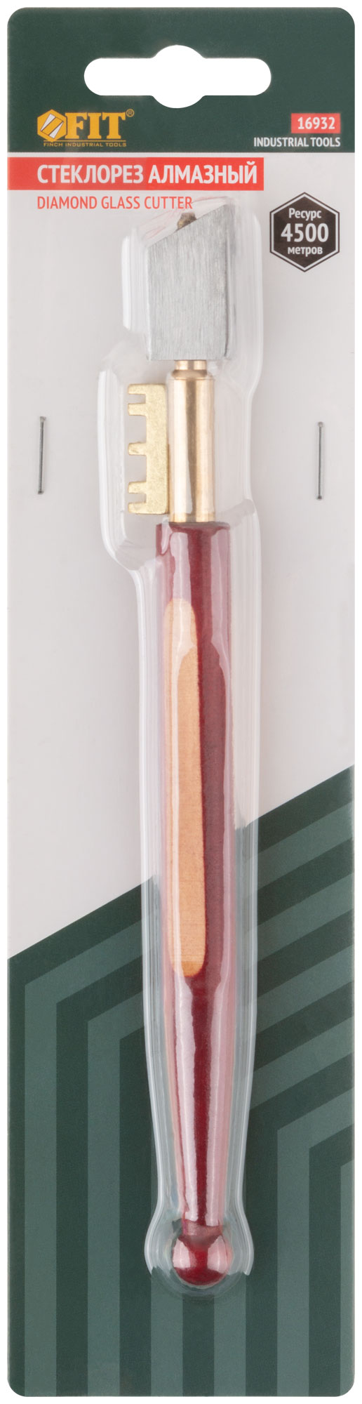 Для резки стекол толщиной до 5 мм. Ресурс до 4500 м. Материал: инструментальная сталь, алмазный резак, деревянная ручка. Упаковка: блистер.
