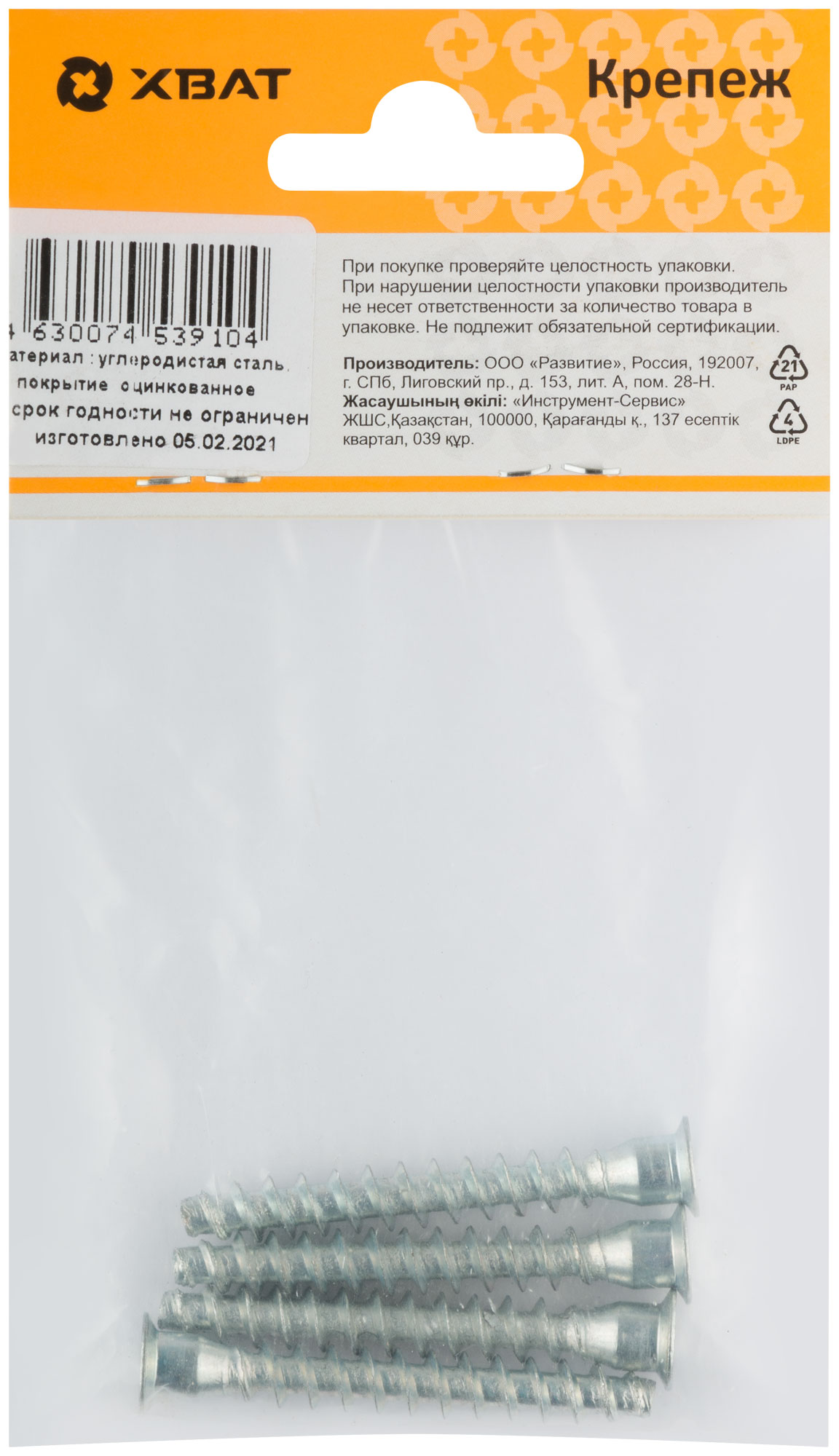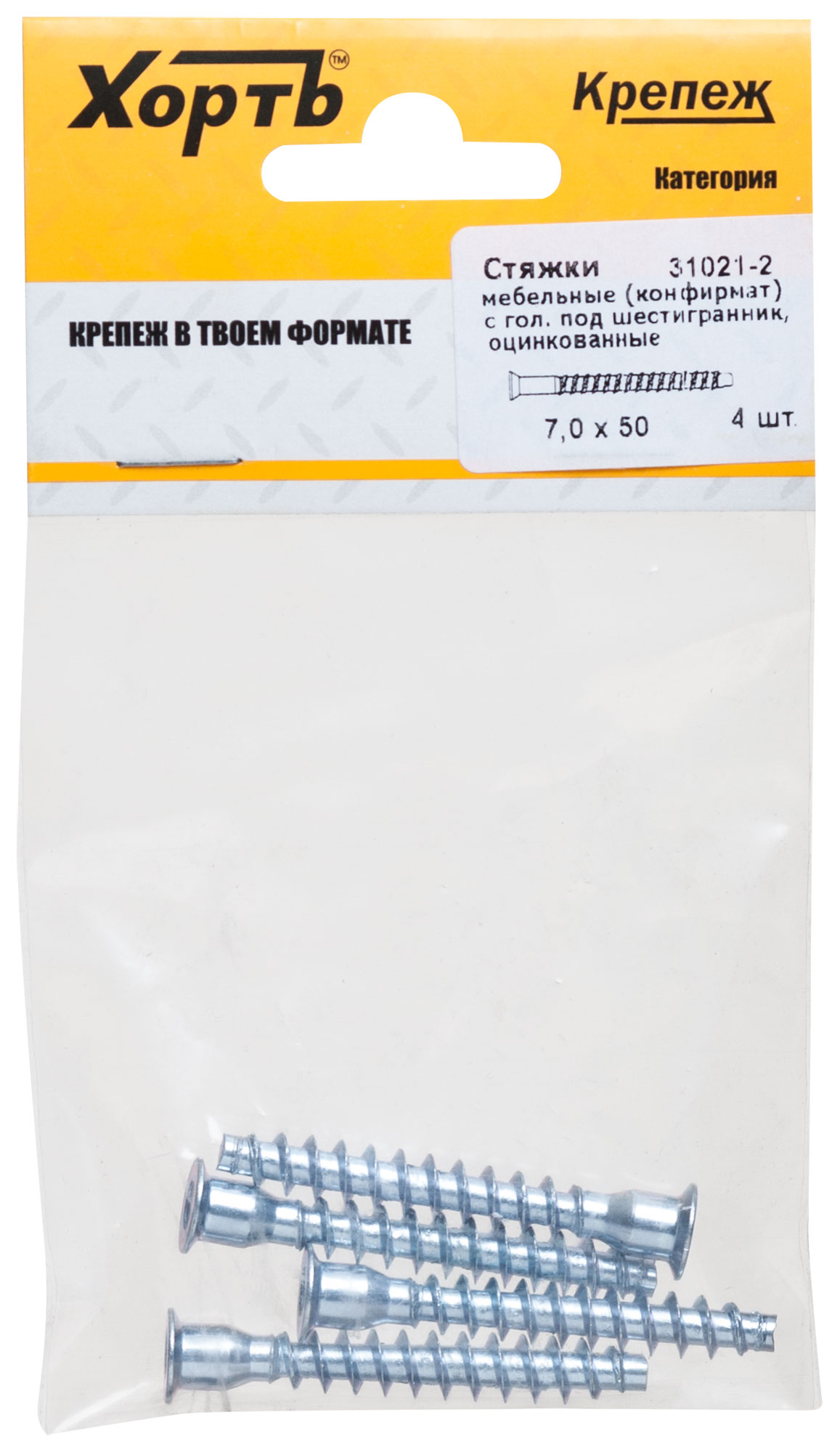 Стяжки мебельные (конфирмат) с головкой под шестигранник, оцинкованные 7 х 50 (фасовка 4 шт.)